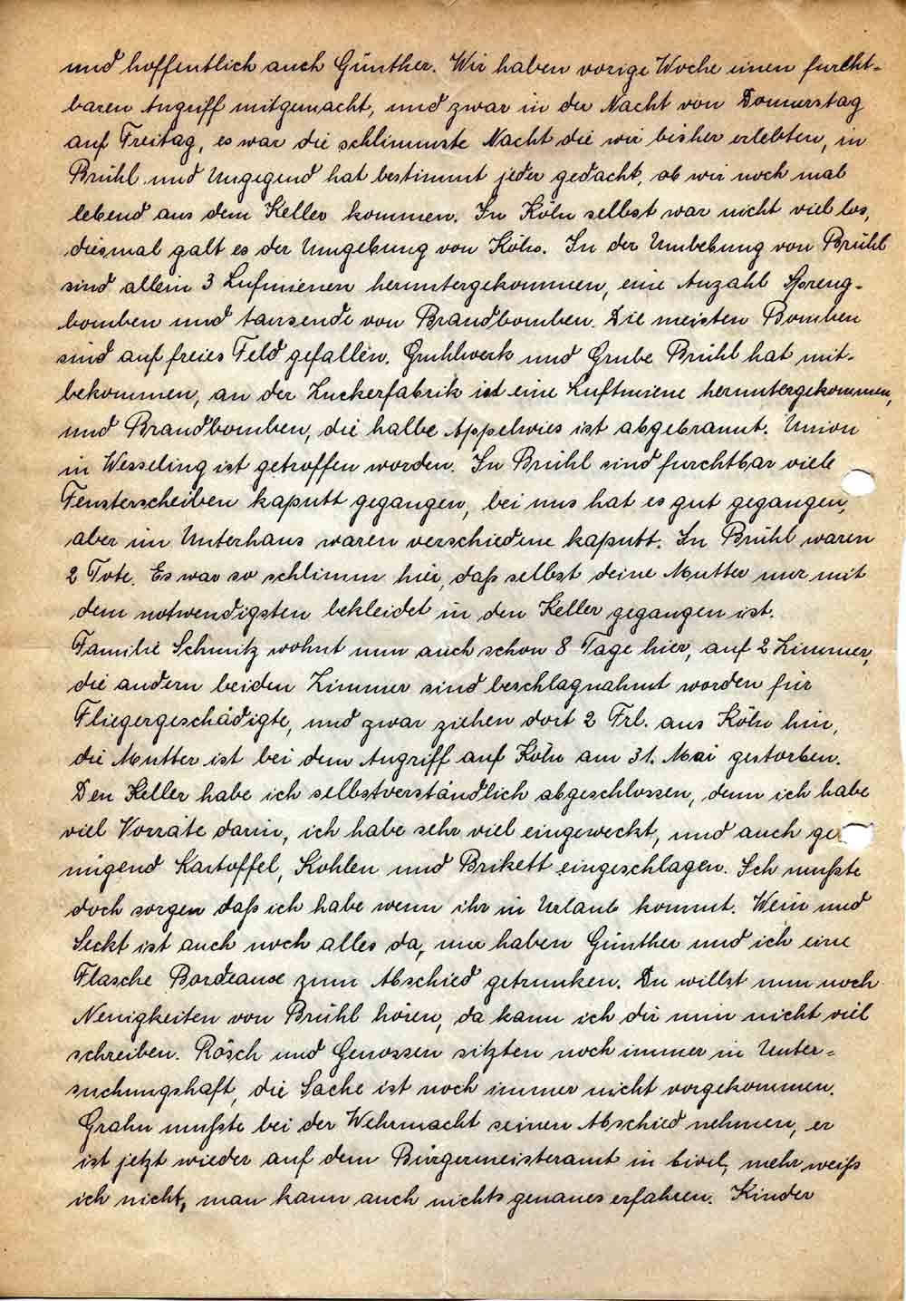 und hoffentlich auch Günther. Wir haben vorige Woche einen furchtbaren Angriff mitgemacht, und zwar in der Nacht von Donnerstag auf Freitag, es war die schlimmste Nacht die wir bisher erlebten, in Brühl und Umgegend hat bestimmt jeder gedacht, ob wir noch mal lebend aus dem Keller kommen. In Köln selbst war nicht viel los, diesmal galt es der Umgebung von Köln. In der Umgebung von Brühl sind allein 3 Lufmienen heruntergekommen, eine Anzahl Sprengbomben und tausende von Brandbomben. Die meisten Bomben sind auf freies Feld gefallen. Gruhlwerk und Grube Brühl hat mitbekommen, an der Zuckerfabrik ist eine Luftmiene heruntergekommen, und Brandbomben, die halbe Appelwies ist abgebrannt. Union in Wesseling ist getroffen worden. In Brühl sind furchtbar viele Fensterscheiben kaputt gegangen, bei uns hat es gut gegangen, aber im Unterhaus waren verschiedene kaputt. In Brühl waren 2 Tote. Es war so schlimm hier, daß selbst deine Mutter nur mit dem notwendigsten bekleidet in den Keller gegangen ist.