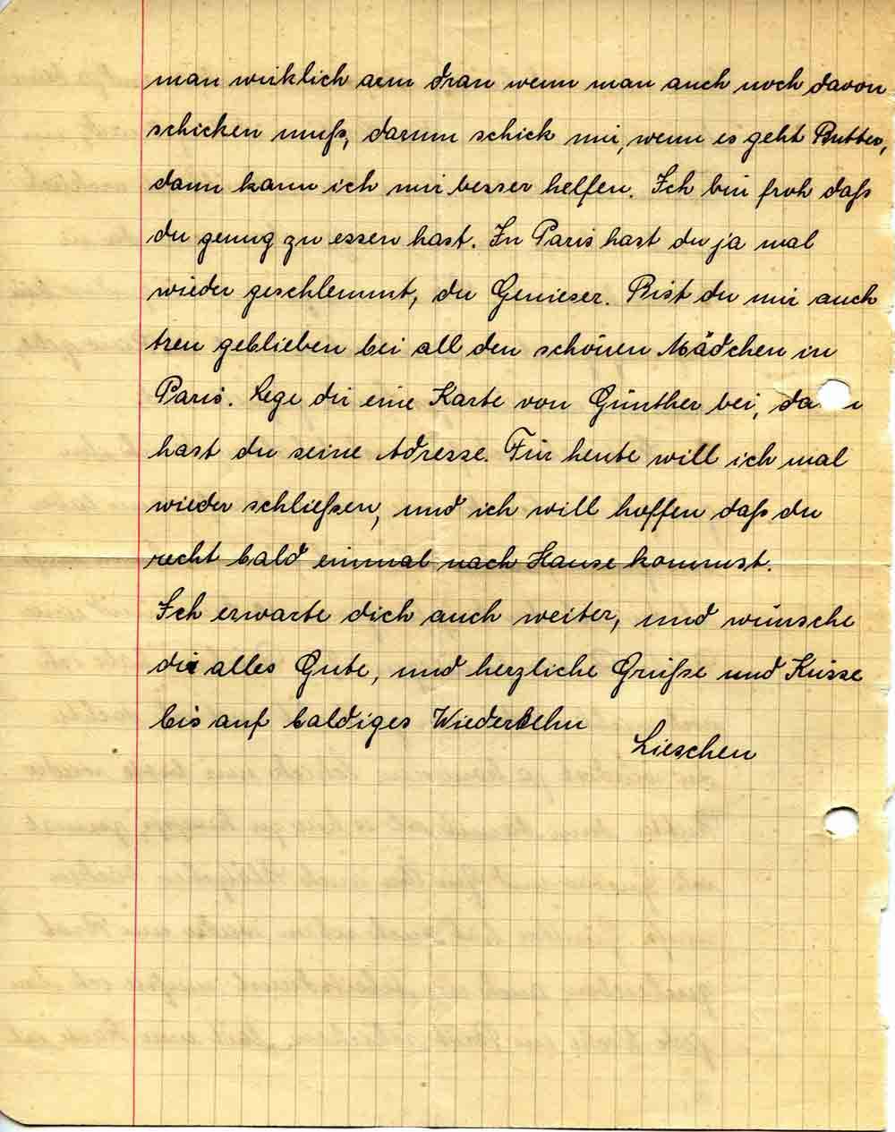 man wirklich arm dran wenn man auch noch davon schicken muß, darum schick mir, wenn es geht Butter, dann kann ich mir besser helfen. Ich bin froh daß du genug zu essen hast. In Paris hast du ja mal wieder geschlemmt, du Genieser. Bist du mir auch treu geblieben bei all den schönen Mädchen in Paris. Lege dir eine Karte von Günther bei, darin hast du seine Adresse. Für heute will ich mal wieder schließen, und ich will hoffen daß du recht bald einmal nach Hause kommst.