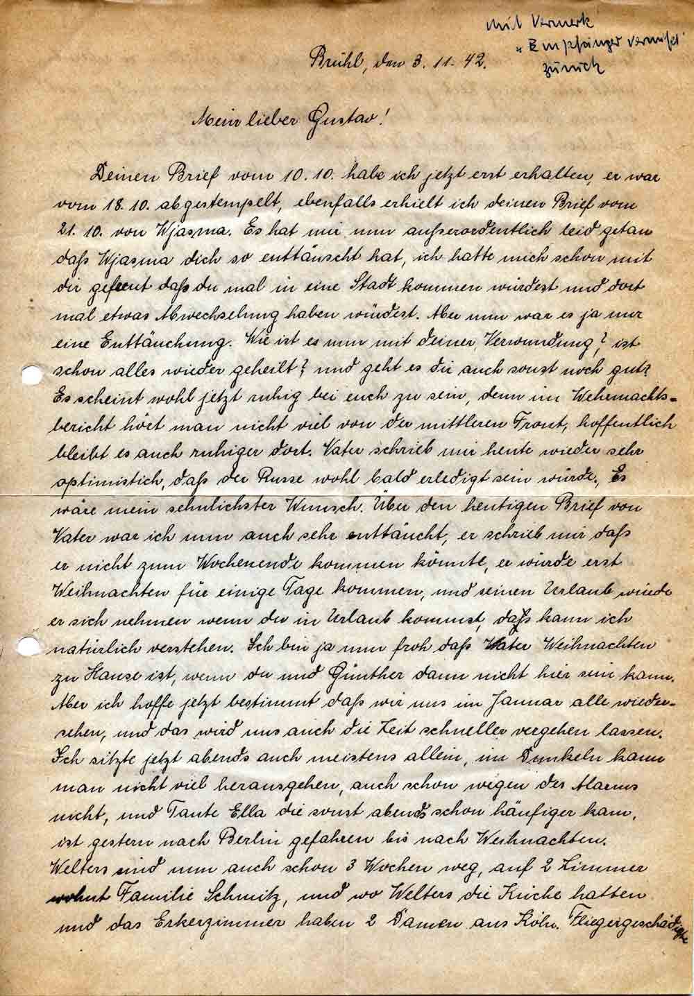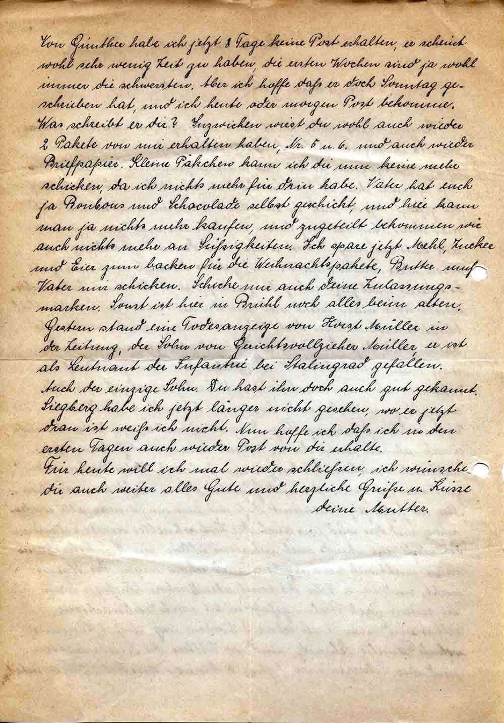 Von Günther habe ich jetzt 8 Tage keine Post erhalten, er scheint wohl sehr wenig Zeit zu haben, die ersten Wochen sind ja wohl immer die schwersten. Aber ich hoffe daß er doch Sonntag geschrieben hat, und ich heute oder morgen Post bekomme. Was schreibt er dir? Inzwischen wirst du wohl auch wieder 2 Pakete von mir erhalten haben, Nr. 5 u. 6. und auch wieder Briefpapier. Kleine Päkchen kann ich dir nun keine mehr schicken, da ich nichts mehr für drin habe. Vater hat euch ja Bonbons und Schocolade selbst geschickt, und hier kann man ja nichts mehr kaufen, und zugeteilt bekommen wir auch nichts mehr an Süßigkeiten. Ich spare jetzt Mehl, Zucker und Eier zum backen für die Weihnachtspakete, Butter muß Vater mir schicken. Schicke mir auch deine Zulassungsmarken. Sonst ist hier in Brühl noch alles beim alten. Gestern stand eine Todesanzeige von Horst Müller in der Zeitung, der Sohn von Gerichtsvollzieher Müller, er ist als Leutnant der Infanterie bei Stalingrad gefallen. Auch der einzige Sohn. Du hast ihn doch auch gut gekannt. Siegberg habe ich jetzt länger nicht gesehen, wo er jetzt dran ist weiß ich nicht. Nun hoffe ich daß ich in den ersten Tagen auch wieder Post von dir erhalte.