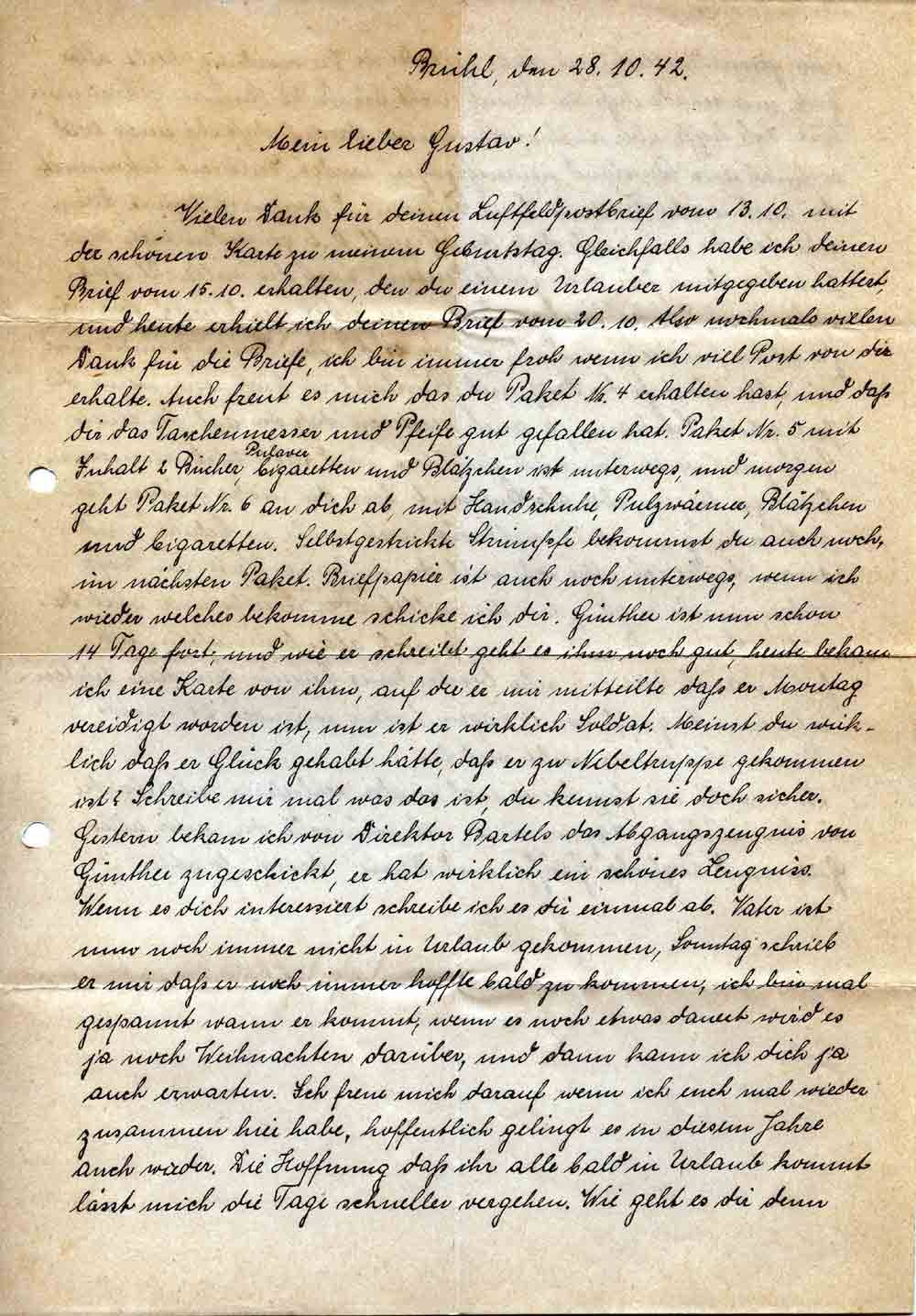 Vielen Dank für deinen Luftfeldpostbrief vom 13.10. mit der schönen Karte zu meinem Geburtstag. Gleichfalls habe ich deinen Brief vom 15.10. erhalten, den du einem Urlauber mitgegeben hattest, und heute erhielt ich deinen Brief vom 20.10. Also nochmals vielen Dank für die Briefe, ich bin immer froh wenn ich viel Post von dir erhalte. Auch freut es mich das du Paket Nr. 4 erhalten hast, und daß dir das Taschenmesser und Pfeife gut gefallen hat. Paket Nr. 5 mit Inhalt 2 Bücher, Pulover, Cigaretten und Blätzchen ist unterwegs, und morgen geht Paket Nr. 6 an dich ab, mit Handschuhe, Pulzwärmer, Blätzchen und Cigaretten. Selbstgestrickte Strümpfe bekommst du auch noch, im nächsten Paket. Briefpapier ist auch noch unterwegs, wenn ich wieder welches bekomme schicke ich dir. Günther ist nun schon 14 Tage fort, und wie er schreibt geht es ihm noch gut, heute bekam ich eine Karte von ihm, auf der er mir mitteilte daß er Montag vereidigt worden ist, nun ist er wirklich Soldat. Meinst du wirklich daß er Glück gehabt hätte, daß er zu Nebeltruppe gekommen ist? Schreibe mir mal was das ist, du kennst sie doch sicher. Gestern bekam ich von Direktor Bartels das Abgangszeugnis von Günther zugeschickt, er hat wirklich ein schönes Zeugniss. Wenn es dich interessiert schreibe ich es dir einmal ab. Vater ist nun noch immer nicht in Urlaub gekommen, Sonntag schrieb er mir daß er noch immer hoffte bald zu kommen, ich bin mal gespannt wann er kommt, wenn es noch etwas dauert wird es ja noch Weihnachten darüber, und dann kann ich dich ja auch erwarten. Ich freue mich darauf wenn ich euch mal wieder zusammen hier habe, hoffentlich gelingt es in diesem Jahre auch wieder. Die Hoffnung daß ihr alle bald in Urlaub kommt lässt mich die Tage schneller vergehen. Wie geht es dir denn