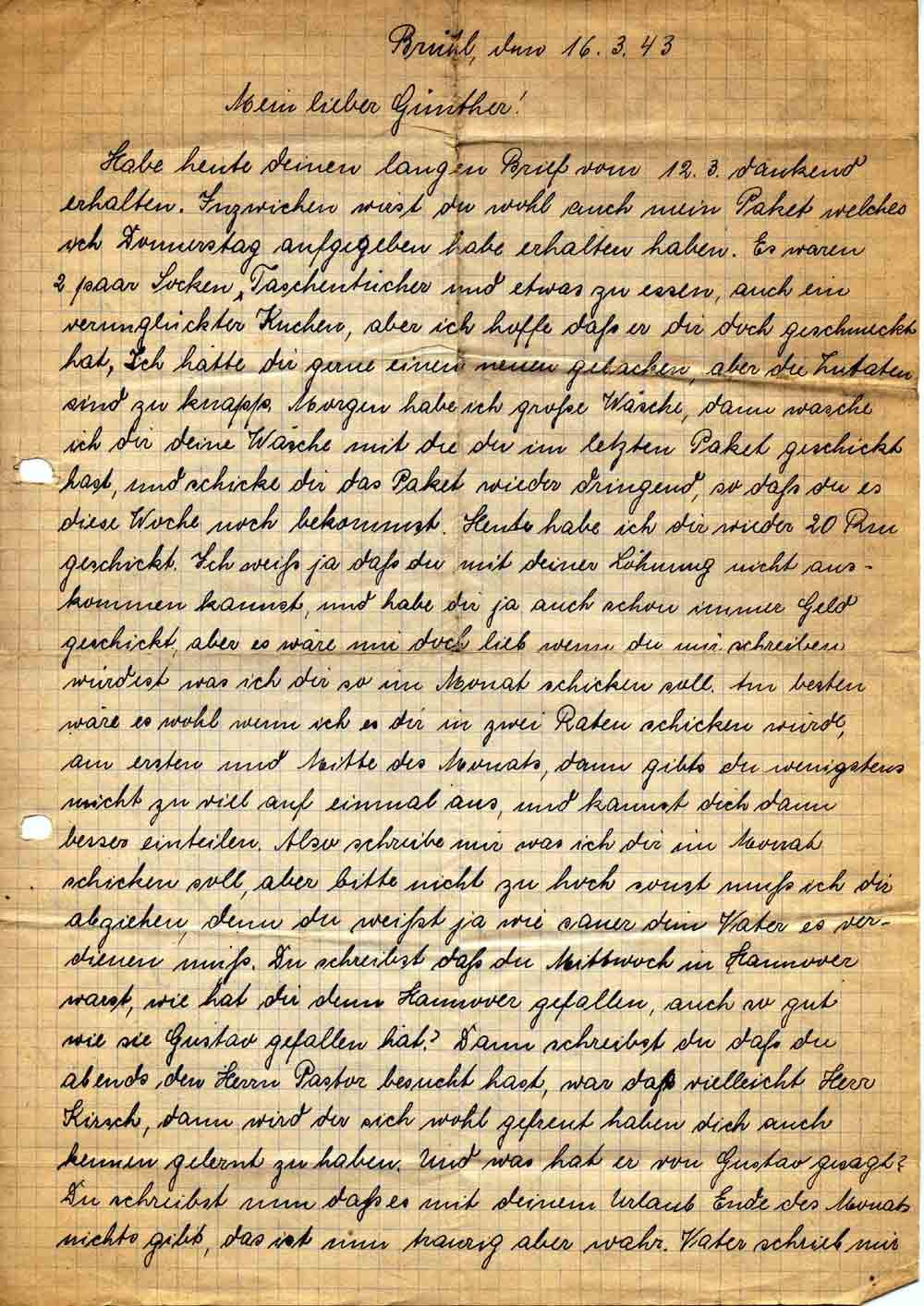 Habe heute deinen langen Brief vom 12.3. dankend erhalten. Inzwischen wirst du wohl auch mein Paket welches ich Donnerstag aufgegeben habe erhalten haben. Es waren 2 paar Socken, Taschentücher und etwas zu essen, auch ein verunglückter Kuchen, aber ich hoffe daß er dir doch geschmeckt hat. Ich hätte dir gerne einen neuen gebacken, aber die Zutaten sind zu knapp. Morgen habe ich große Wäsche, dann wasche ich dir deine Wäsche mit die du im letzten Paket geschickt hast, und schicke dir das Paket wieder dringend, so daß du es diese Woche noch bekommst. Heute habe ich dir wieder 20 Rm geschickt. Ich weiß ja daß du mit deiner Löhnung nicht auskommen kannst, und habe dir ja auch schon immer Geld geschickt, aber es wäre mir doch lieb wenn du mir schreiben würdest was ich dir so im Monat schicken soll. Am besten wäre es wohl wenn ich es dir in zwei Raten schicken würde, am ersten und Mitte des Monats, dann gibst du wenigstens nicht zu viel auf einmal aus, und kannst dich dann besser einteilen. Also schreibe mir was ich dir im Monat schicken soll, aber bitte nicht zu hoch sonst muß ich dir abziehen, denn du weißt ja wie sauer dein Vater es verdienen muß. Du schreibst daß du Mittwoch in Hannover warst, wie hat dir denn Hannover gefallen, auch so gut wie sie Gustav gefallen hat? Dann schreibst du daß du abends den Herrn Pastor besucht hast, war das vielleicht Herr Kirsch, dann wird der sich wohl gefreut haben dich auch kennen gelernt zu haben. Und was hat er von Gustav gesagt? Du schreibst nun daß es mit deinem Urlaub Ende des Monats nichts gibt, das ist nun traurig aber wahr. Vater schrieb mir