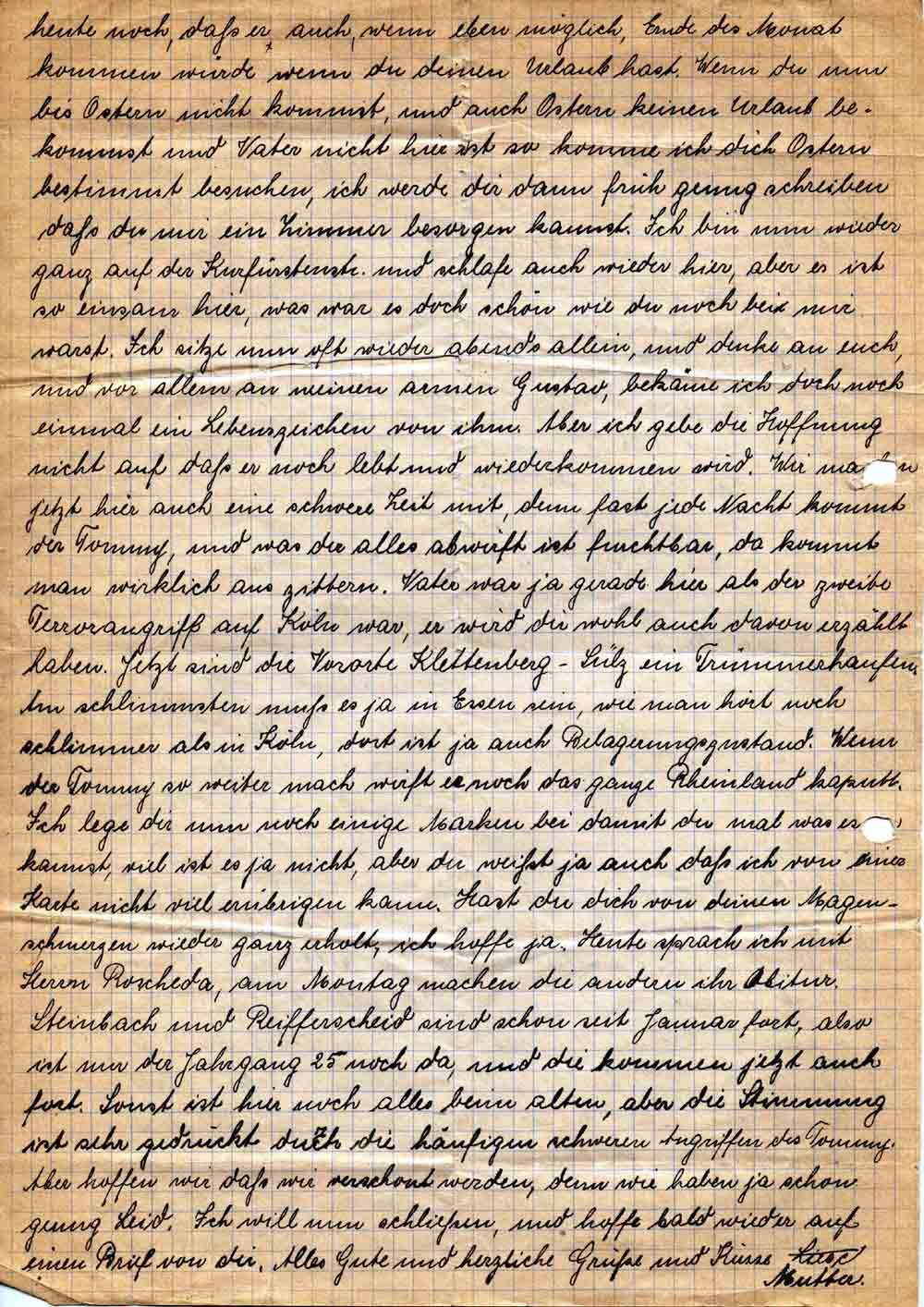 heute noch, daß er auch, wenn eben möglich, Ende des Monats kommen würde wenn du deinen Urlaub hast. Wenn du nun bis Ostern nicht kommst, und auch Ostern keinen Urlaub bekommst und Vater nicht hier ist so komme ich dich Ostern bestimmt besuchen, ich werde dir dann früh genug schreiben daß du mir ein Zimmer besorgen kannst. Ich bin nun wieder ganz auf der Kurfürstenstr. und schlafe auch wieder hier, aber es ist so einsam hier, was war es doch schön wie du noch bei mir warst. Ich sitze nun oft wieder abends allein, und denke an euch, und vor allem an meinen armen Gustav, bekäme ich doch noch einmal ein Lebenszeichen von ihm. Aber ich gebe die Hoffnung nicht auf daß er noch lebt und wiederkommen wird. Wir machen jetzt hier auch eine schwere Zeit mit, denn fast jede Nacht kommt der Tommy, und was der alles abwirft ist furchtbar, da kommt man wirklich ans zittern. Vater war ja gerade hier als der zweite Terrorangriff auf Köln war, er wird dir wohl auch davon erzählt haben. Jetzt sind die Vororte Klettenberg-Sülz ein Trümmerhaufen. Am schlimmsten muß es ja in Essen sein, wie man hört noch schlimmer als in Köln, dort ist ja auch Belagerungszustand. Wenn der Tommy so weiter macht wirft er noch das ganze Rheinland kaputt. Ich lege dir nun doch einige Marken bei damit du mal was essen kannst, viel ist es ja nicht, aber du weißt ja auch daß ich von einer Karte nicht viel erübrigen kann. Hast du dich von deinen Magenschmerzen wieder ganz erholt, ich hoffe ja. Heute sprach ich mit Herrn Roscheda, am Montag machen die andern ihr Abitur. Steinbach und Reifferscheid sind schon seit Januar fort, also ist nun der Jahrgang 25 noch da, und die kommen jetzt auch fort. Sonst ist hier noch alles beim alten, aber die Stimmung ist sehr gedrückt durch die häufigen schweren Angriffen des Tommy. Aber hoffen wir daß wir verschont werden, denn wir haben ja schon genug Leid. Ich will nun schließen, und hoffe bald wieder auf einen Brief von dir. Alles Gute und herzliche Grüße und Küsse