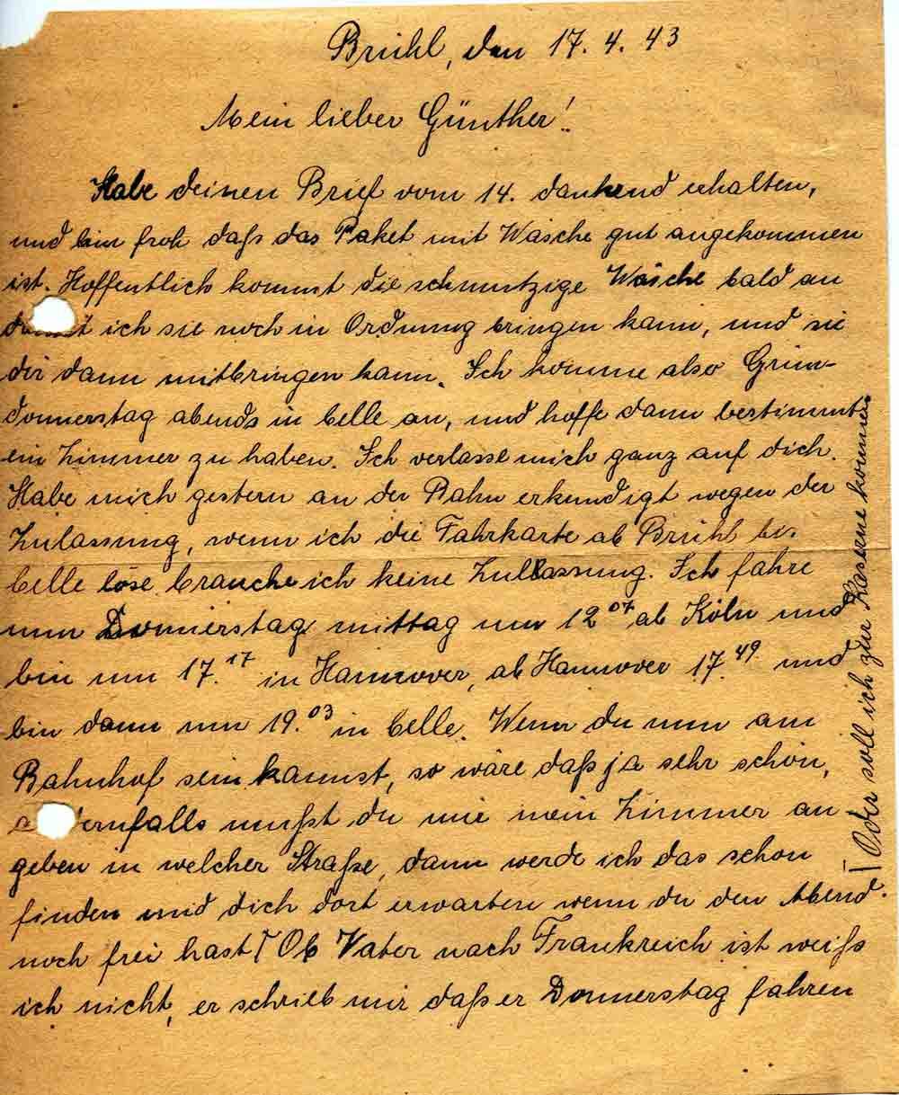 Habe deinen Brief vom 14. dankend erhalten, und bin froh daß das Paket mit Wäsche gut angekommen ist. Hoffentlich kommt die schmutzige Wäsche bald an damit ich sie noch in Ordnung bringen kann, und sie dir dann mitbringen kann. Ich komme also Gründonnerstag abends in Celle an, und hoffe dann bestimmt ein Zimmer zu haben. Ich verlasse mich ganz auf dich. Habe mich gestern an der Bahn erkundigt wegen der Zulassung, wenn ich die Fahrkarte ab Brühl bis Celle löse brauche ich keine Zulassung. Ich fahre nun Donnerstag mittag um 12.07 ab Köln und bin um 17.17 in Hannover, ab Hannover 17.49 und bin dann um 19.03 in Celle. Wenn du nun am Bahnhof sein kannst, so wäre daß ja sehr schön, andernfalls mußt du mir mein Zimmer angeben in welcher Straße, dann werde ich das schon finden und dich dort erwarten wenn du den Abend noch frei hast. Oder soll ich zur Kaserne kommen. Ob Vater nach Frankreich ist weiß ich nicht, er schrieb mir daß er Donnerstag fahren