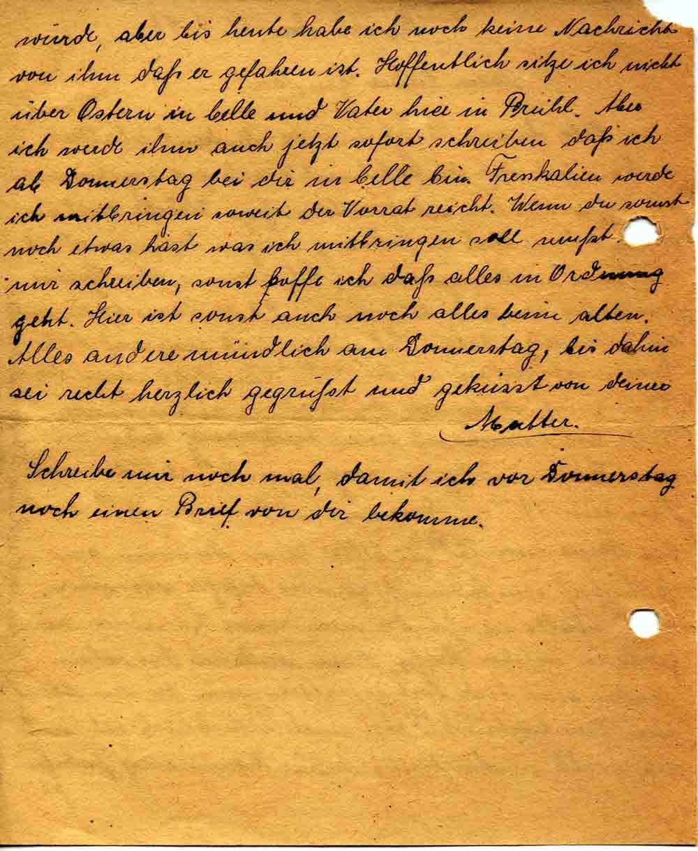 würde, aber bis heute habe ich noch keine Nachricht von ihm daß er gefahren ist. Hoffentlich sitze ich nicht über Ostern in Celle und Vater hier in Brühl. Aber ich werde ihm auch jetzt sofort schreiben daß ich ab Donnerstag bei dir in Celle bin. Fresskalien werde ich mitbringen soweit der Vorrat reicht. Wenn du sonst noch etwas hast was ich mitbringen soll mußt du mir schreiben, sonst hoffe ich daß alles in Ordnung geht. Hier ist sonst auch noch alles beim alten.