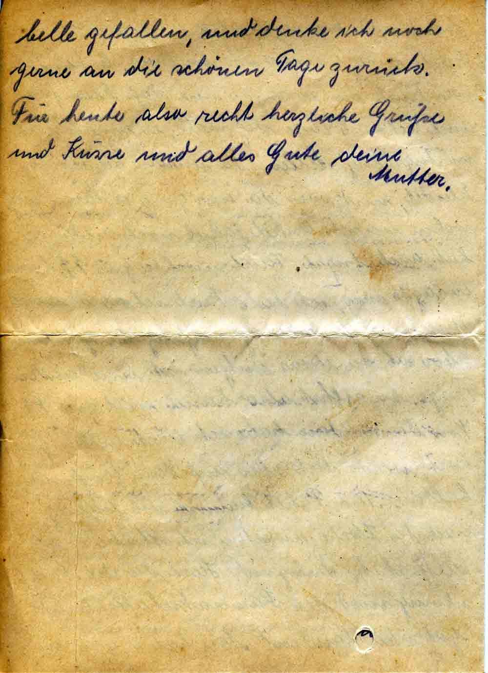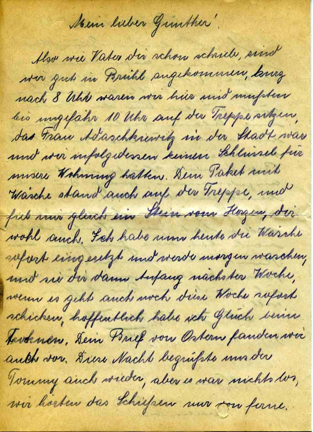 Also wie Vater dir schon schrieb, sind wir gut in Brühl angekommen, kurz nach 8 Uhr waren wir hier und mußten bis ungefähr 10 Uhr auf der Treppe sitzen, da Frau Adaschkiewitz in der Stadt war und wir infolgedessen keinen Schlüssel für unsere Wohnung hatten. Dein Paket mit Wäsche stand auch auf der Treppe, und fiel mir gleich ein Stein vom Herzen, dir wohl auch. Ich habe nun heute die Wäsche sofort eingesetzt und werde morgen waschen, und sie dir dann Anfang nächster Woche, wenn es geht auch noch diese Woche sofort schicken, hoffentlich habe ich Glück beim trocknen. Dein Brief von Ostern fanden wir auch vor. Diese Nacht begrüßte uns der Tommy auch wieder, aber es war nichts los, wir hörten das Schießen nur von ferne.