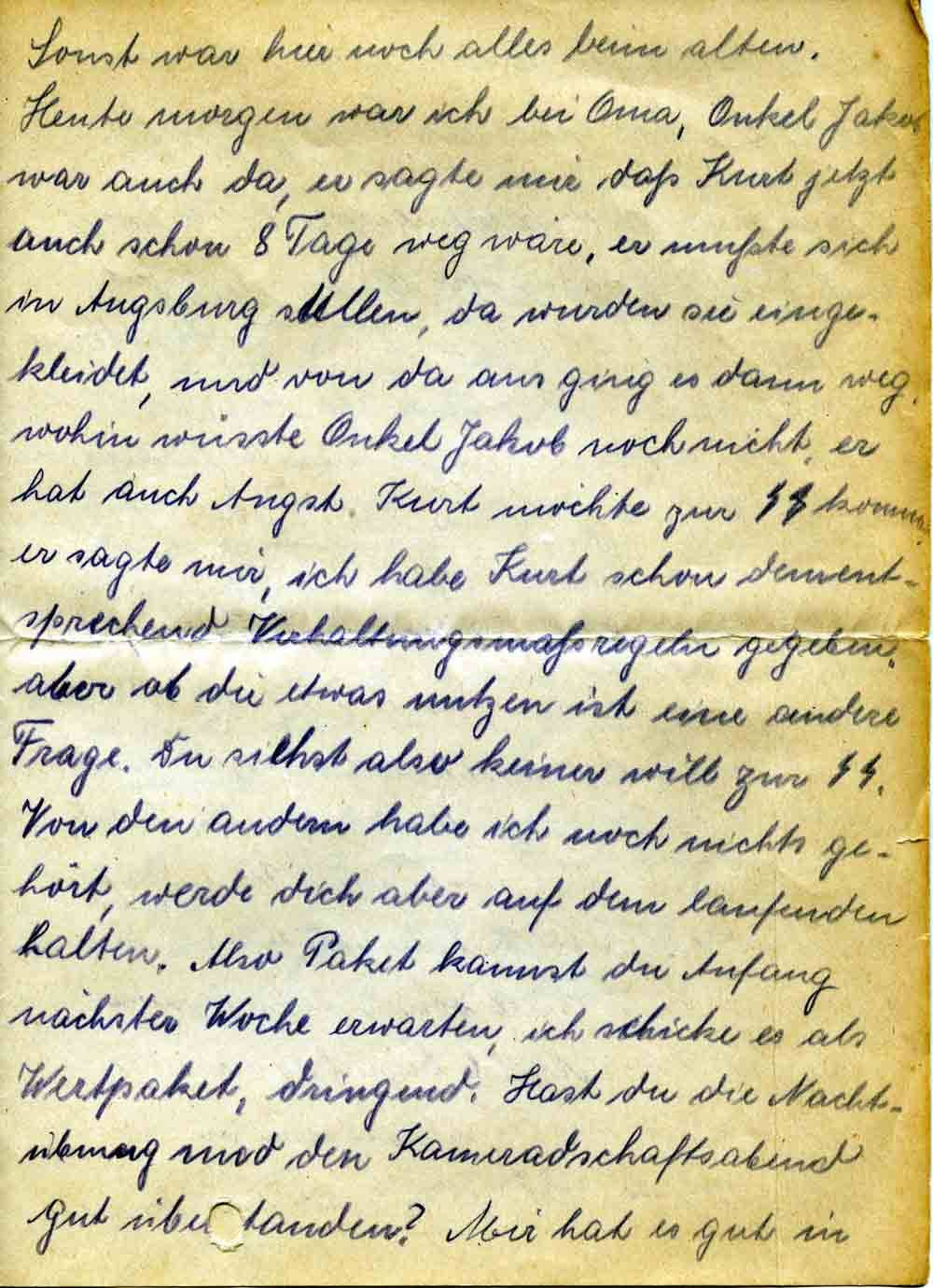 Heute morgen war ich bei Oma, Onkel Jakob war auch da, er sagte mir daß Kurt jetzt auch schon 8 Tage weg wäre, er mußte sich in Augsburg stellen, da wurden sie eingekleidet, und von da aus ging es dann weg, wohin wusste Onkel Jakob noch nicht, er hat auch Angst. Kurt möchte zur SS kommen, er sagte mir, ich habe Kurt schon dementsprechend Verhaltungsmaßregeln gegeben, aber ob die etwas nutzen ist eine andere Frage. Du siehst also keiner will zur SS. Von den andern habe ich noch nichts gehört, werde dich aber auf dem laufenden halten. Also Paket kannst du Anfang nächster Woche erwarten, ich schicke es als Wertpaket, dringend. Hast du die Nachtübung und den Kameradschaftsabend gut überstanden? Mir hat es gut in