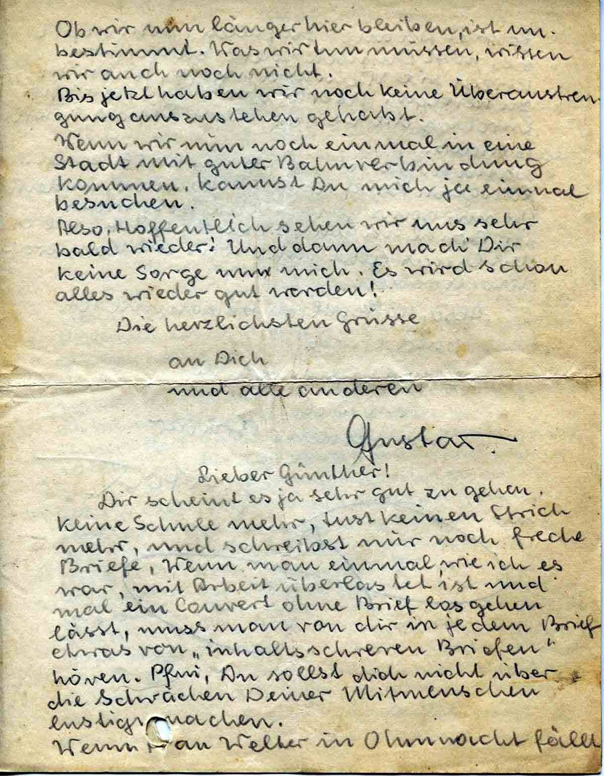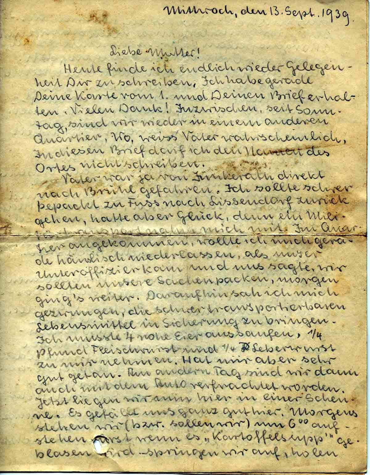 Heute finde ich endlich wieder Gelegenheit Dir zu schreiben. Ich habe gerade Deine Karte vom 1. und Deinen Brief erhalten. Vielen Dank! Inzwischen, seit Sonntag, sind wir wieder in einem anderen Quartier. Wo, weiss Vater wahrscheinlich. In diesen Brief darf ich den Namen des Ortes nicht schreiben.
