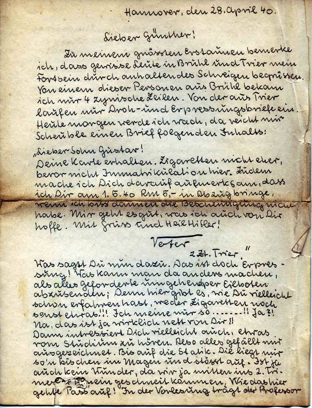 Deine Karte erhalten. Zigaretten nicht eher, bevor nicht Immatrikulation hier. Zudem mache ich Dich darauf aufmerksam, dass ich Dir am 1.5.40 Rm 5,- in Abzug bringe, wenn ich bis dannen die Bescheinigung nicht habe. Mir geht es gut, was ich auch von Dir hoffe. Mit Gruss und Heil Hitler!