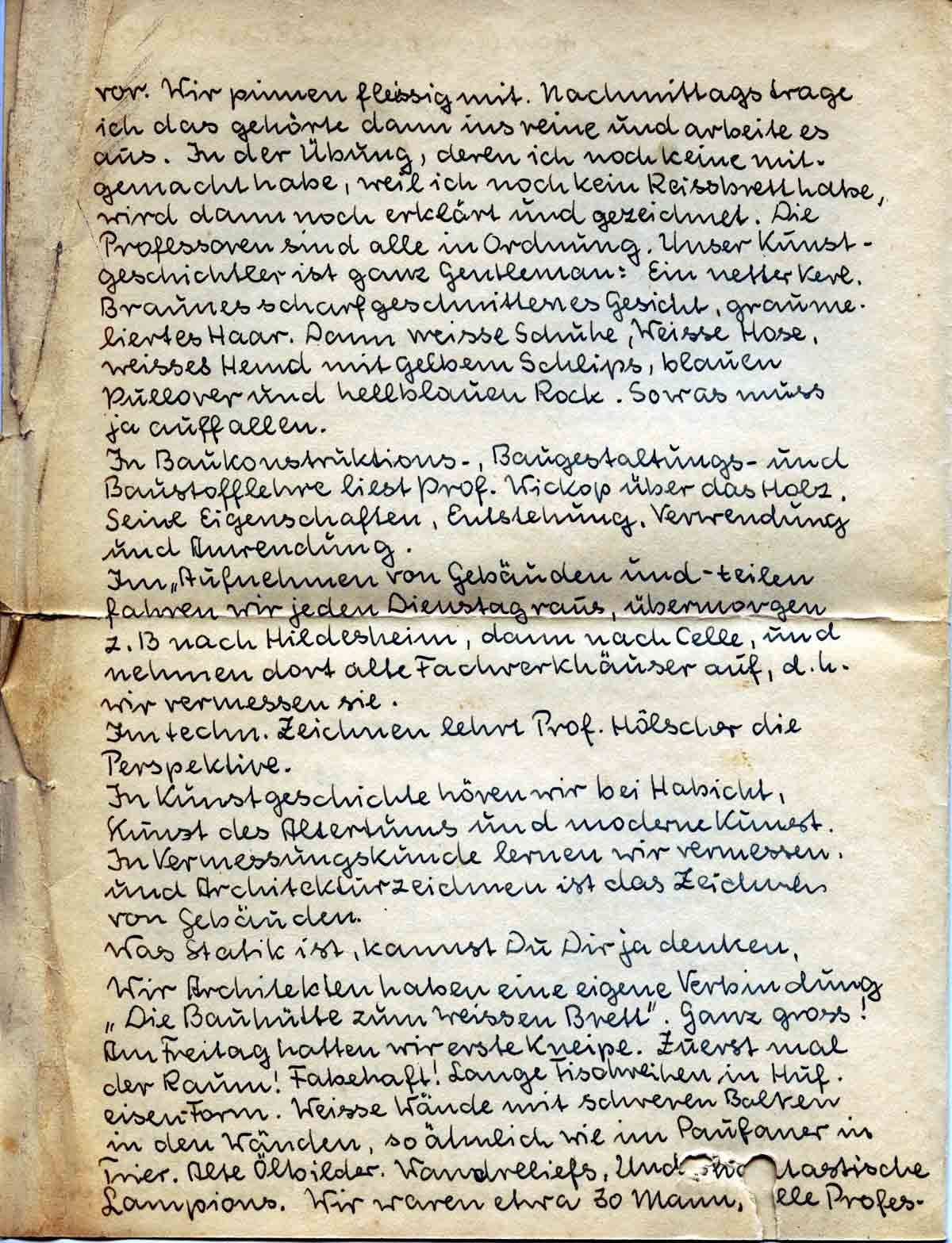vor. Wir pinnen fleissig mit. Nachmittags trage ich das gehörte dann ins reine und arbeite es aus. In der Übung, deren ich noch keine mitgemacht habe, weil ich noch kein Reissbrett habe, wird dann noch erklärt und gezeichnet. Die Professoren sind alle in Ordnung. Unser Kunstgeschichtler ist ganz Gentleman: Ein netter Kerl. Braunes scharf geschnittenes Gesicht, graumeliertes Haar. Dann weisse Schuhe, weisse Hose, weisses Hemd mit gelbem Schlips, blauen Pullover und hellblauen Rock. So was muss ja auffallen.
