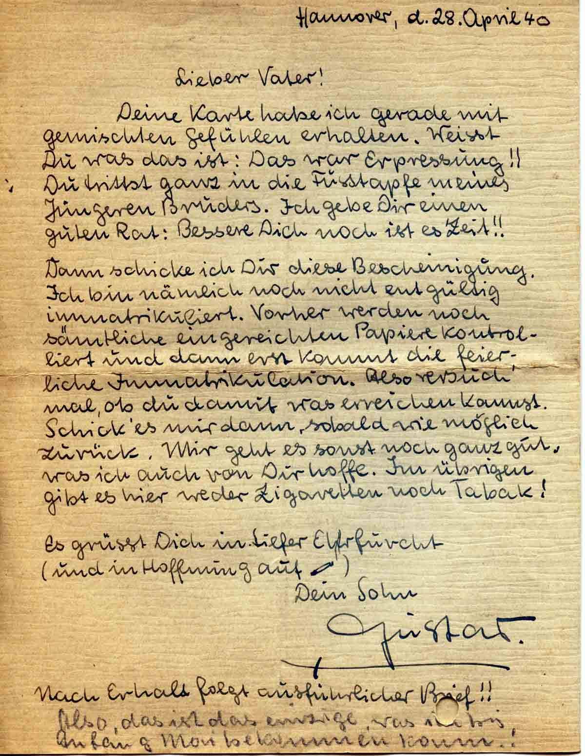 Dann schicke ich Dir diese Bescheinigung. Ich bin nämlich noch nicht entgültig immatrikuliert. Vorher werden noch sämtliche eingereichten Papiere kontrolliert und dann erst kommt die feierliche Immatrikulation. Also versuch’ mal, ob du damit was erreichen kannst. Schick’ es mir dann, sobald wie möglich zurück. Mir geht es sonst noch ganz gut, was ich auch von Dir hoffe. Im übrigen gibt es hier weder Zigaretten noch Tabak!