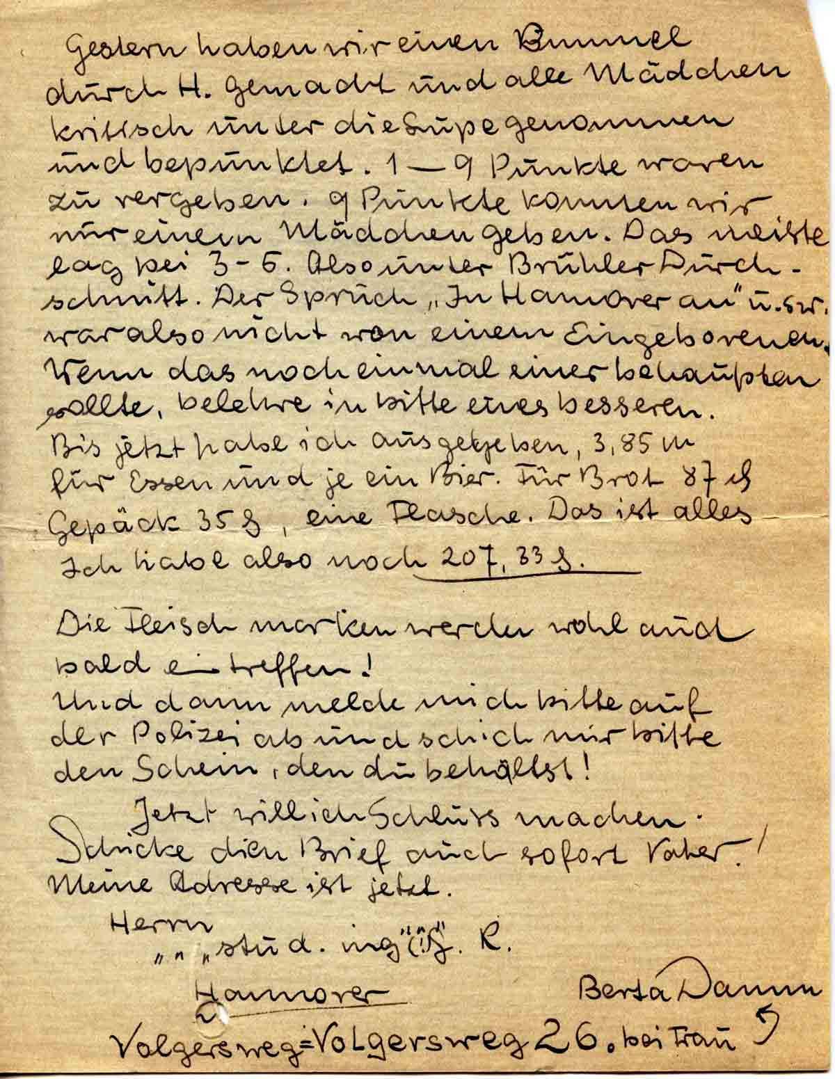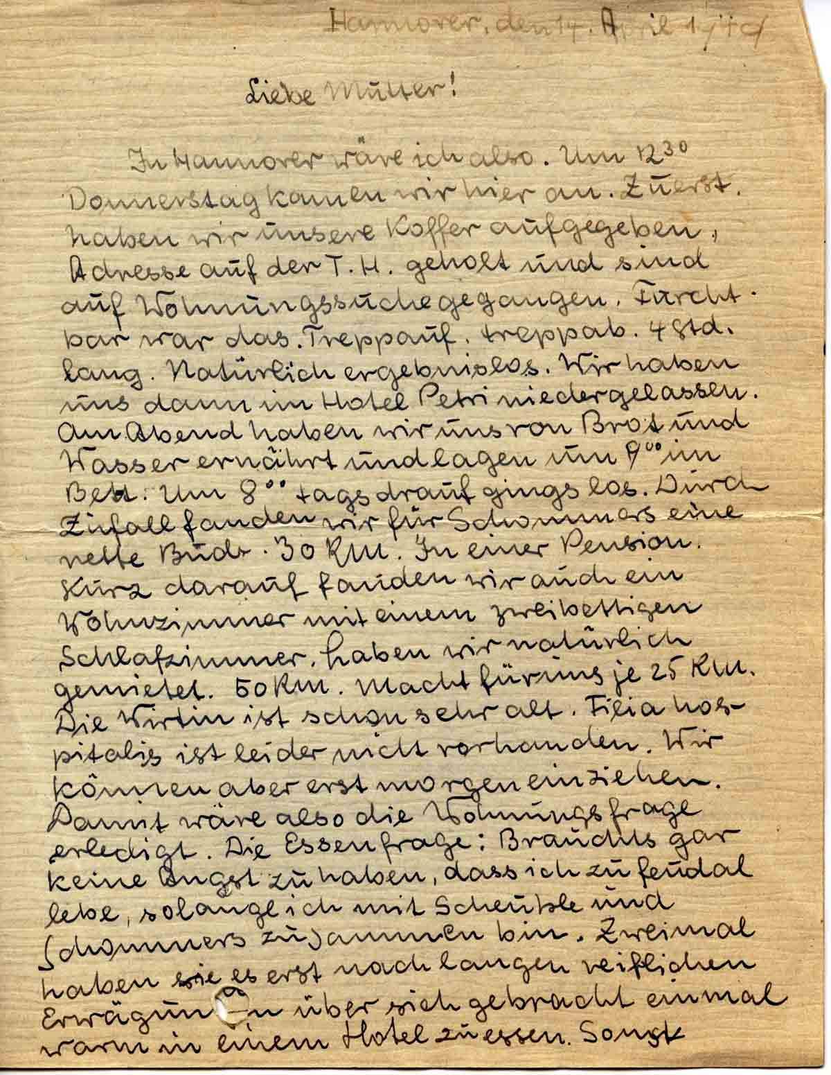 In Hannover wäre ich also. Um 12.30 Donnerstag kamen wir hier an. Zuerst haben wir unsere Koffer aufgegeben, Adresse auf der T.H. geholt und sind auf Wohnungssuche gegangen. Furchtbar war das. Treppauf, treppab. 4 Std. lang. Natürlich ergebnislos. Wir haben uns dann im Hotel Petri niedergelassen. Am Abend haben wir uns von Brot und Wasser ernährt und lagen um 9.00 im Bett. Um 8.00 tags drauf gings los. Durch Zufall fanden wir für Schommers eine nette Bude. 30 Rm. In einer Pension. Kurz darauf fanden wir auch ein Wohnzimmer mit einem zweibettigen Schlafzimmer. Haben wir natürlich gemietet. 50 Rm. Macht für uns je 25 Rm. Die Wirtin ist schon sehr alt. Filia hospitalis ist leider nicht vorhanden. Wir können aber erst morgen einziehen. Damit wäre also die Wohnungsfrage erledigt. Die Essensfrage: Brauchts gar keine Angst zu haben, dass ich zu feudal lebe, solange ich mit Scheuble und Schommers zusammen bin. Zweimal haben sie es erst nach langen reiflichen Erwägungen über sich gebracht einmal warm in einem Hotel zu essen. Sonst