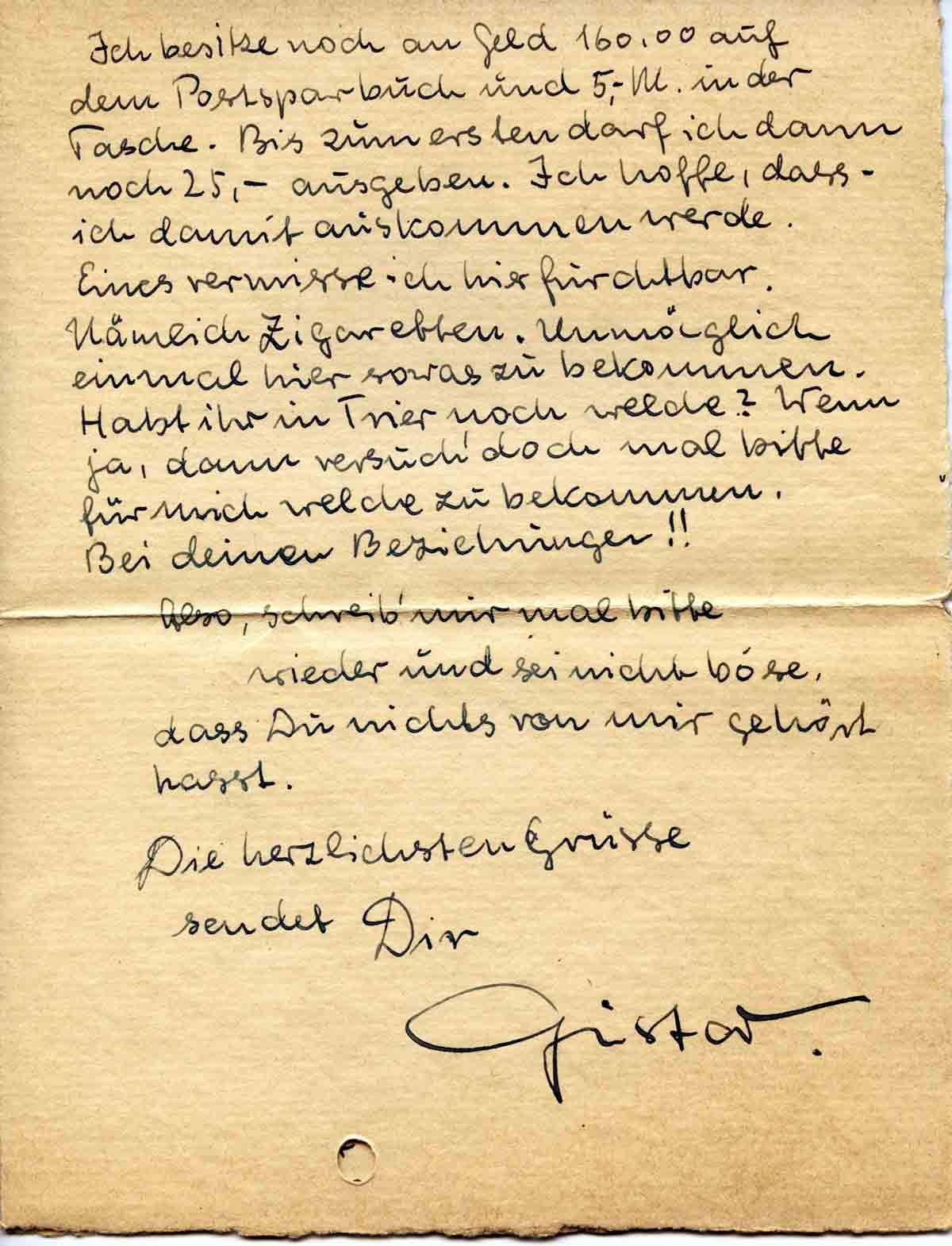 Ich besitze noch an Geld 160,00 auf dem Postsparbuch und 5,- M. in der Tasche. Bis zum ersten darf ich dann noch 25,- ausgeben. Ich hoffe, dass ich damit auskommen werde. Eines vermisse ich hier furchtbar.