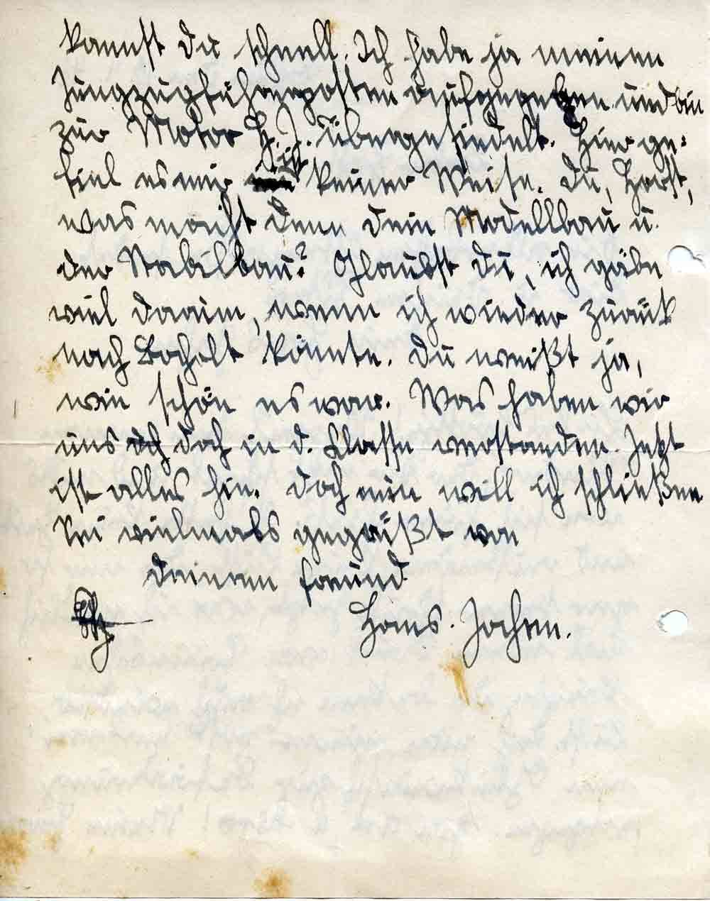 kannst Du schnell. Ich habe ja meinen Jungzugführerposten aufgegeben und bin zur Motor H.J. übergesiedelt. Hier gefiel es mir in keiner Weise. Du, Horst, was macht denn Dein Modellbau u. der Stabilbau? Glaubst Du, ich gäbe viel darum, wenn ich wieder zurück nach Bocholt könnte. Du weißt ja, wie schön es war. Was haben wir uns doch in d. Classe verstanden. Jetzt ist alles hin. Doch nun will ich schließen. Sei vielmals gegrüßt von