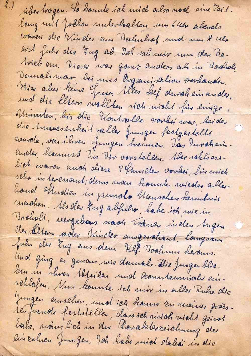 2.) übertragen. So konnte ich mich also noch eine Zeitlang mit Jochen unterhalten, um 6 Uhr abends waren die Kinder am Bahnhof und um 8 Uhr erst fuhr der Zug ab. Ich sah mir nun den Betrieb an. Dieser war ganz anders als in Bocholt. Damals war bei uns Organisation vorhanden. Hier aber keine Spur. Alles lief durcheinander, und die Eltern wollten sich nicht für einige Minuten, bis die Kontrolle vorbei war, bei der die Anwesenheit aller Jungen festgestellt wurde, von ihren Jungen trennen. Das Durcheinander kannst Du Dir vorstellen. Aber schliesslich waren auch diese 2 Stunden vorbei, für mich sehr interessant; denn man konnte wieder allerhand Studien in puncto Menschenkenntnis machen. Als der Zug abfuhr, habe ich, wie in Bocholt, vergebens nach Tränen in den Augen der Eltern oder Kinder ausgeschaut. Langsam fuhr der Zug aus dem Hbf. Bochum heraus. Und ging es genau wie damals. Die Jungen blieben in ihren Abteilen und konnten nicht einschlafen. Nun konnte ich mir in aller Ruhe die Jungen ansehen, und ich kann zu meiner grössten Freude feststellen, dass ich mich nicht geirrt habe, nämlich in der Charakterzeichnung der einzelnen Jungen. Ich habe mich dabei in die