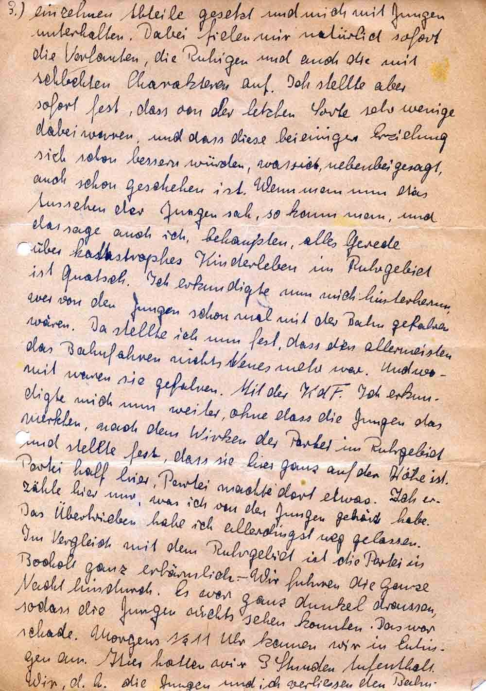 einzelnen Abteile gesetzt und mich mit Jungen unterhalten. Dabei fielen mir natürlich sofort die Vorlauten, die Ruhigen und auch die mit schlechten Charakteren auf. Ich stellte aber sofort fest, dass von der letzten Sorte sehr wenige dabei waren, und dass diese bei einiger Erziehung sich schon bessern würden, was nebenbei gesagt, auch schon geschehen ist. Wenn man nun das Aussehen der Jungen sah, so kann man, und das sage auch ich, behaupten, alles Gerede über katastrophes Kinderleben im Ruhrgebiet ist Quatsch. Ich erkundigte nun mich hintenherum, wer von den Jungen schon mal mit der Bahn gefahren wären. Da stellte ich nun fest, dass den allermeisten das Bahnfahren nichts Neues mehr war. Und womit waren sie gefahren. Mit der KdF. Ich erkundigte mich nun weiter, ohne dass die Jungen das merkten, nach dem Wirken der Partei im Ruhrgebiet und stellte fest, dass sie hier ganz auf der Höhe ist. Partei half hier, Partei machte dort etwas. Ich erzähle hier nur, was ich von den Jungen gehört habe. Das Übertrieben habe ich allerdings weg gelassen. Im Vergleich mit dem Ruhrgebiet ist die Partei in Bocholt ganz erbärmlich. – Wir fuhren die ganze Nacht hindurch. Es war ganz dunkel draussen, sodass die Jungen nichts sehen konnten. Das war schade. Morgens ½ 11 Uhr kamen wir in Eutingen an. Hier hatten wir 3 Stunden Aufenthalt. Wir, d. h. die Jungen und ich verliessen den Bahn-