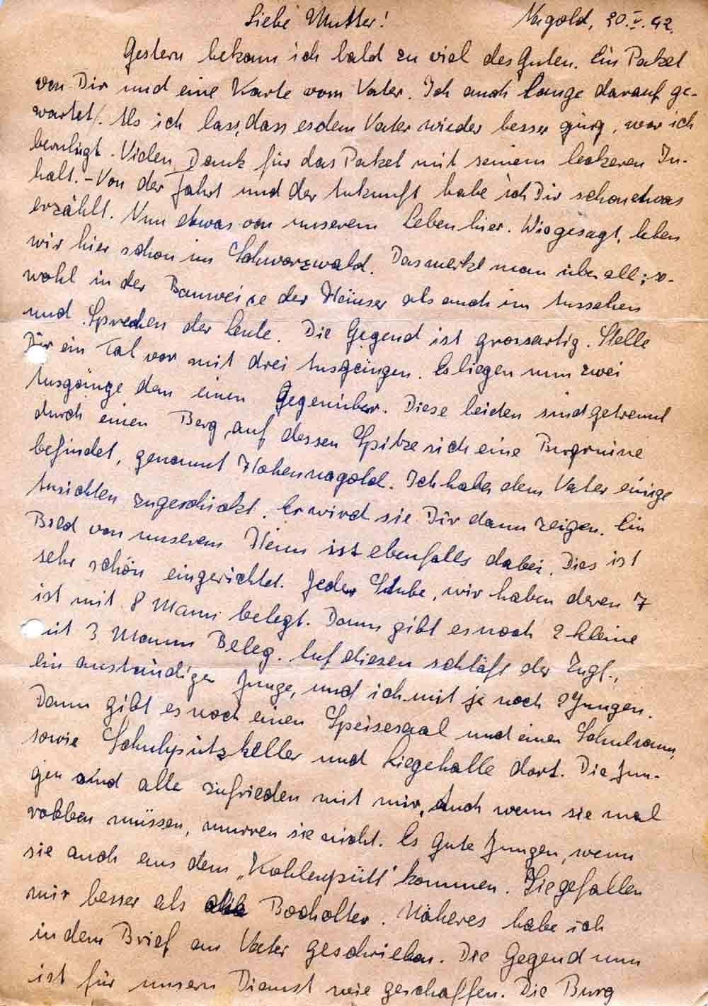 Gestern bekam ich bald zu viel des Guten. Ein Paket von Dir und eine Karte von Vater. Ich auch lange darauf gewartet. Als ich las, dass es dem Vater wieder besser ging, war ich beruhigt. Vielen Dank für das Paket mit seinem leckeren Inhalt. – Von der Fahrt und der Ankunft habe ich Dir schon etwas erzählt. Nun etwas von unserem Leben hier. Wie gesagt, leben wir hier schon im Schwarzwald. Das merkt man überall; sowohl in der Bauweise der Häuser als auch im Aussehen und Sprechen der Leute. Die Gegend ist grossartig. Stelle Dir ein Tal vor mit drei Ausgängen. Es liegen nun zwei Ausgänge dem einen gegenüber. Diese beiden sind getrennt durch einen Berg, auf dessen Spitze sich eine Bergruine befindet, genannt Hohennagold. Ich habe dem Vater einige Ansichten zugeschickt. Er wird sie Dir dann zeigen. Ein Bild von unserem Heim ist ebenfalls dabei. Dies ist sehr schön eingerichtet. Jede Stube, wir haben deren 7 ist mit 8 Mann belegt. Dann gibt es noch 2 kleine mit 3 Mann Beleg. Auf diesen schläft der Zugf., ein anständiger Junge, und ich mit je noch 2 Jungen. Dann gibt es noch einen Speisesaal und einen Schulraum, sowie Schuhputzkeller und Liegehalle dort. Die Jungen sind alle zufrieden mit mir, auch wenn sie mal robben müssen, murren sie nicht. Es gute Jungen, wenn sie auch aus dem „Kohlenpütt“ kommen. Sie gefallen mir besser als die Bocholter. Näheres habe ich in dem Brief an Vater geschrieben. Die Gegend nun ist für unsern Dienst wie geschaffen. Die Burg