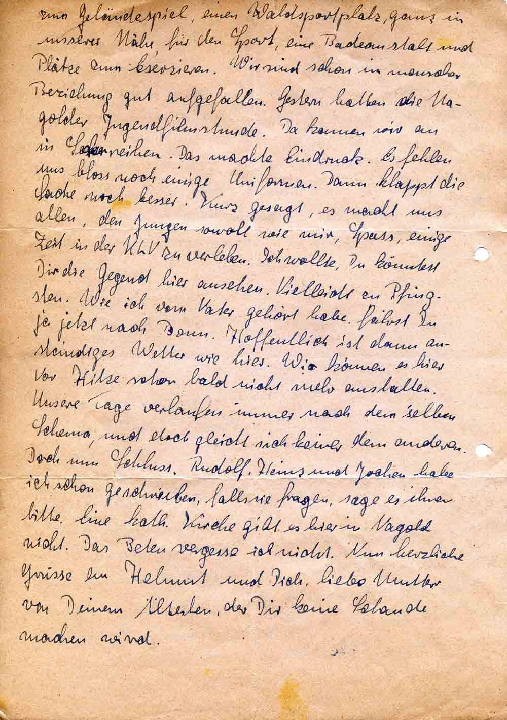 zum Geländespiel, einen Waldsportplatz, ganz in unserer Nähe, für den Sport, eine Badeanstalt und Plätze zum Exerzieren. Wir sind schon in mancher Beziehung gut aufgefallen. Gestern hatten die Nagolder Jugendfilmstunde. Da kamen wir an in Sechserreihen. Das machte Eindruck. Es fehlen uns bloss noch einige Uniformen. Dann klappt die Sache noch besser. Kurz gesagt, es macht uns allen, den Jungen sowohl wie mir, Spass, einige Zeit in der KLV zu verleben. Ich wollte, Du könntest Dir die Gegend hier ansehen. Vielleicht zu Pfingsten. Wie ich vom Vater gehört habe, fährst Du ja jetzt nach Bonn. Hoffentlich ist dann anständiges Wetter wie hier. Wir können es hier vor Hitze schon bald nicht mehr aushalten. Unsere Tage verlaufen immer nach dem selben Schema, und doch gleicht sich keiner dem anderen. Doch nun Schluss. Rudolf, Heinz und Jochen habe ich schon geschrieben, falls sie fragen, sage es ihnen bitte. Eine kath. Kirche gibt es hier in Nagold nicht. Das Beten vergesse ich nicht. Nun herzliche Grüsse an Helmut und Dich, liebe Mutter von Deinem Ältesten, der Dir keine Schande machen wird.