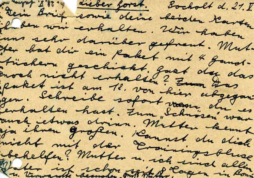 Dein Brief sowie deine beiden Karten haben wir erhalten. Wir haben uns sehr darüber gefreut. Mutter hat dir ein Paket mit 4 Handtüchern geschickt. Hast du das noch nicht erhalten? Das Paket ist am 12. von hier abgegangen. Schreibe sofort wenn du es erhalten hast. Zum „Schnösen“ war auch etwas drinn. Mutter kennt ja ihren Großen. Kannst du dich nicht mit der Trainingsbluse behelfen? Mutter u. ich sind allein. Vater ist schon seit 8 Tagen in Bonn u. Verwandte besuchen. Gruß Mutter.