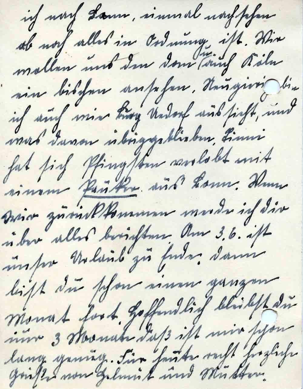 ich nach Bonn, einmal nachsehen ob noch alles in Ordnung ist. Wir wollen uns den Dom u. auch Köln ein bischen ansehen. Neugierig bin ich auch wie Burg Uedorf aussieht, und was davon übriggeblieben. Tinni hat sich Pfingsten verlobt mit einem Pauker aus Bonn. Wenn wir zurückkommen werde ich Dir über alles berichten. Am 3.6. ist unser Urlaub zu Ende, dann bist Du schon einen ganzen Monat fort. Hoffentlich bleibst Du nur 3 Monate daß ist mir schon lang genug. Für Heute recht herzliche Grüße von Helmut und Mutter.