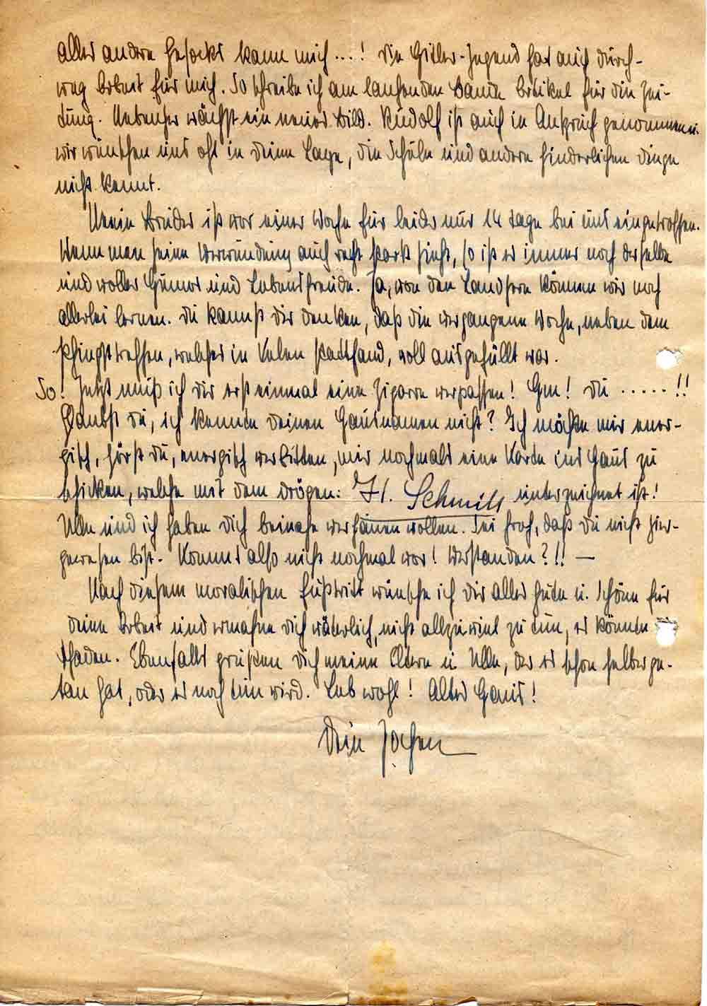 Nach diesem moralischen Fußtritt wünsche ich Dir alles Gute u. Schöne für Deine Arbeit und ermahne Dich väterlich, nicht allzuviel zu tun, es könnte schaden. Ebenfalls grüßen Dich meine Eltern u. Ulle, der es schon selber getan hat, oder es noch tun wird. Leb wohl! Altes Haus!