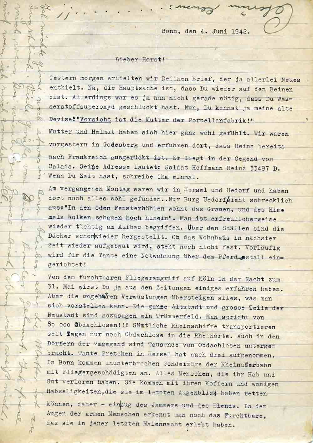 Von dem furchtbaren Fliegerangriff auf Köln in der Nacht zum 31. Mai wirst Du ja aus den Zeitungen einiges erfahren haben. Aber die ungeheuren Verwüstungen übersteigen alles, was man sich vorstellen kann. Die ganze Altstadt und grosse Teile der Neustadt sind sozusagen ein Trümmerfeld. Man spricht von 80 000 Obdachlosen!!! Sämtliche Rheinschiffe transportieren seit Tagen nur noch Obdachlose in die Rheinorte. Auch in den Dörfern der Umgegend sind Tausende von Obdachlosen untergebracht. Tante Gretchen in Hersel hat auch drei aufgenommen. In Bonn kommen ununterbrochen Sonderzüge der Rheinuferbahn mit Fliegergeschädigten an. Alles Menschen, die ihr Hab und Gut verloren haben. Sie kommen mit ihren Koffern und wenigen Habseligkeiten, die sie im letzten Augenblick haben retten können, daher – ein Zug des Jammers und des Elends. In den Augen der armen Menschen erkennt man noch das Furchtbare, das sie in jener letzten Maiennacht erlebt haben.