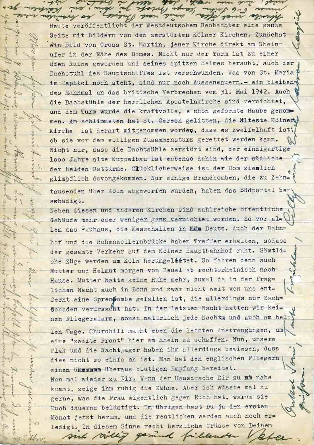 Neben diesen und anderen Kirchen sind zahlreiche öffentliche Gebäude mehr oder weniger ganz vernichtet worden. So vor allem das Gauhaus, die Messehallen in Deutz. Auch der Bahnhof und die Hohenzollernbrücke haben Treffer erhalten, sodass der gesamte Verkehr auf dem Kölner Hauptbahnhof ruht. Sämtliche Züge werde um Köln herumgeleitet. So fahren denn auch Mutter und Helmut morgen von Beuel ab rechtsrheinisch nach Hause. Mutter hatte keine Ruhe mehr, zumal da in der fraglichen Nacht auch in Bonn und zwar nicht weit von uns entfernt eine Sprengbombe gefallen ist, die allerdings nur Sachschaden verursacht hat. In der letzten Nacht hatten wir keinen Fliegeralarm, sonst natürlich jede Nacht und auch am hellen Tage. Churchill macht eben die letzten Anstrengungen, um eine „zweite Front“ hier am Rhein zu schaffen. Nun, unsere Flak und die Nachtjäger haben ihm allerdings bewiesen, dass dies nicht so einfach ist. Man hat den englischen Fliegern einen überaus blutigen Empfang bereitet.
