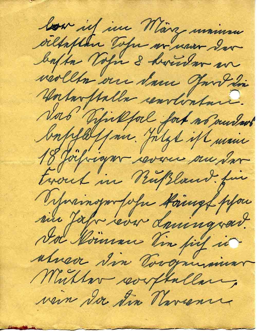 lor ich im März meinen ältesten Sohn er war der beste Sohn & Bruder er wollte an dem Gerd die Vaterstelle vertreten. Das Schicksal hat es anders beschlossen. Jetzt ist mein 18 Jähriger vorn an der Front in Rußland. Ein Schwiegersohn kämpft schon ein Jahr vor Leningrad. Da können Sie sich in etwa die Sorgen einer Mutter vorstellen, wie da die Nerven