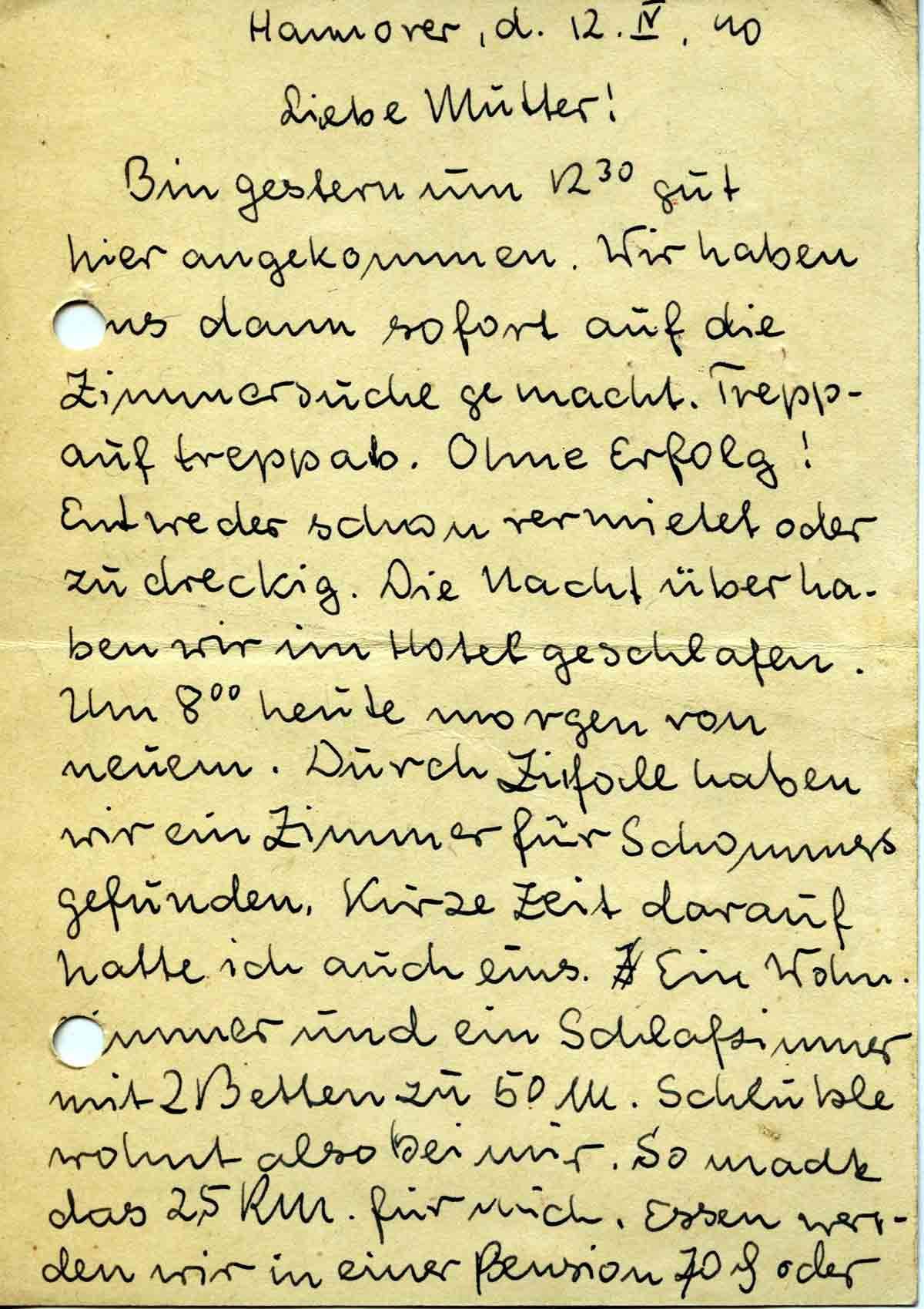 Bin gestern um 12.30 gut hier angekommen. Wir haben uns dann sofort auf die Zimmersuche gemacht. Treppauf treppab. Ohne Erfolg! Entweder schon vermietet oder zu dreckig. Die Nacht über haben wir im Hotel geschlafen. Um 8.00 heute morgen von neuem. Durch Zufall haben wir ein Zimmer für Schommers gefunden. Kurze Zeit darauf hatte ich auch eins. Ein Wohnzimmer und ein Schlafzimmer mit 2 Betten zu 50 M. Scheuble wohnt also bei mir. So macht das 25 RM. für mich. Essen werden wir in einer Pension 70 Pf oder