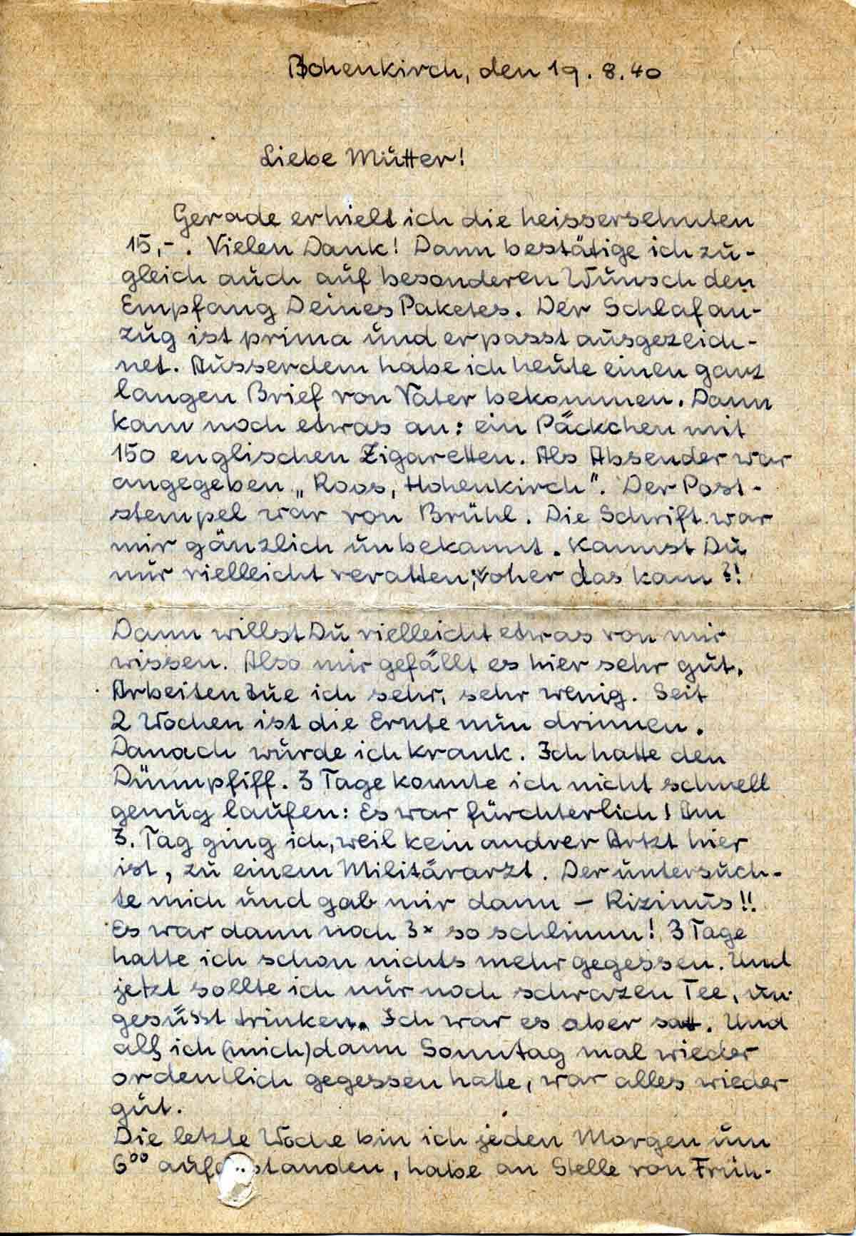 Gustav Roos an Mutter Elisabeth, 19. August 1940