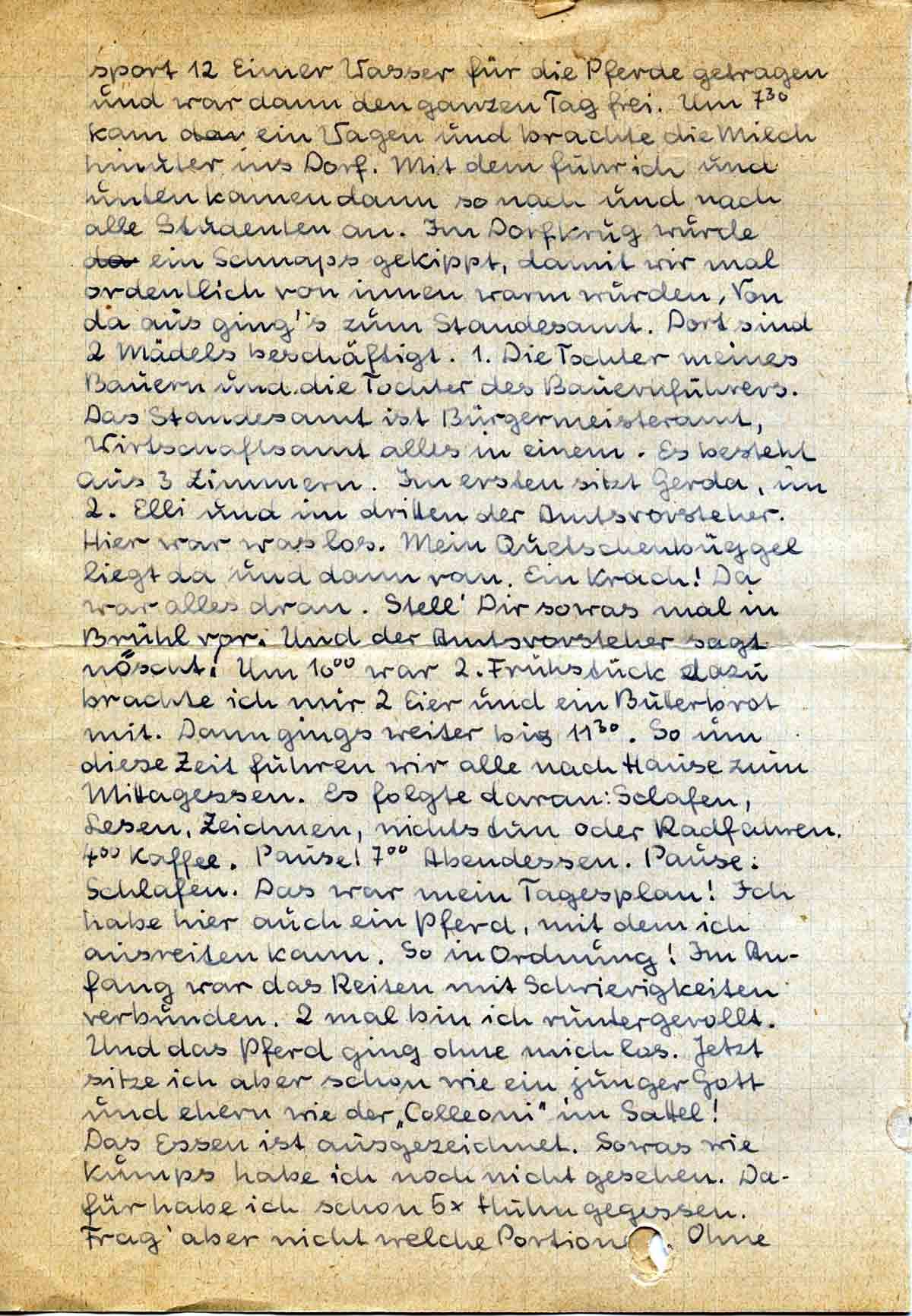 Frühsport 12 Eimer Wasser für die Pferde getragen und war dann den ganzen Tag frei. Um 7.30 kam ein Wagen und brachte die Milch hinunter ins Dorf. Mit dem fuhr ich und unten kamen dann so nach und nach alle Studenten an. Im Dorfkrug wurde ein Schnaps gekippt, damit wir mal ordentlich von innen warm wurden. Von da aus ging’s zum Standesamt. Dort sind 2 Mädels beschäftigt. 1. Die Tochter meines Bauern und die Tochter des Bauernführers. Das Standesamt ist Bürgermeisteramt, Wirtschaftsamt alles in einem. Es besteht aus 3 Zimmern. Im ersten sitzt Gerda, im 2. Elli und im dritten der Amtsvorsteher. Hier war was los. Mein Quetschenbüggel liegt da und dann ran. Ein Krach! Da war alles dran. Stell’ Dir sowas mal in Brühl vor. Und der Amtsvorsteher sagt nöscht! Um 10.00 war 2. Frühstück dazu brachte ich mir 2 Eier und ein Butterbrot mit. Dann gings weiter bis 11.30. So um diese Zeit fuhren wir alle nach Hause zum Mittagessen. Es folgte daran: Schlafen, Lesen, Zeichnen, nichts tun oder Radfahren. 4.00 Kaffee. Pause! 7.00 Abendessen. Pause. Schlafen. Das war mein Tagesplan! Ich habe hier auch ein Pferd, mit dem ich ausreiten kann. So in Ordnung! Im Anfang war das Reiten mit Schwierigkeiten verbunden. 2 mal bin ich runtergerollt. Und das Pferd ging ohne mich los. Jetzt sitze ich aber schon wie ein junger Gott und ehern wie der „Colleoni“ im Sattel! Das Essen ist ausgezeichnet. Sowas wie Kumps habe ich noch nicht gesehen. Dafür habe ich schon 5 x Huhn gegessen. Frag’ aber nicht welche Portionen. Ohne