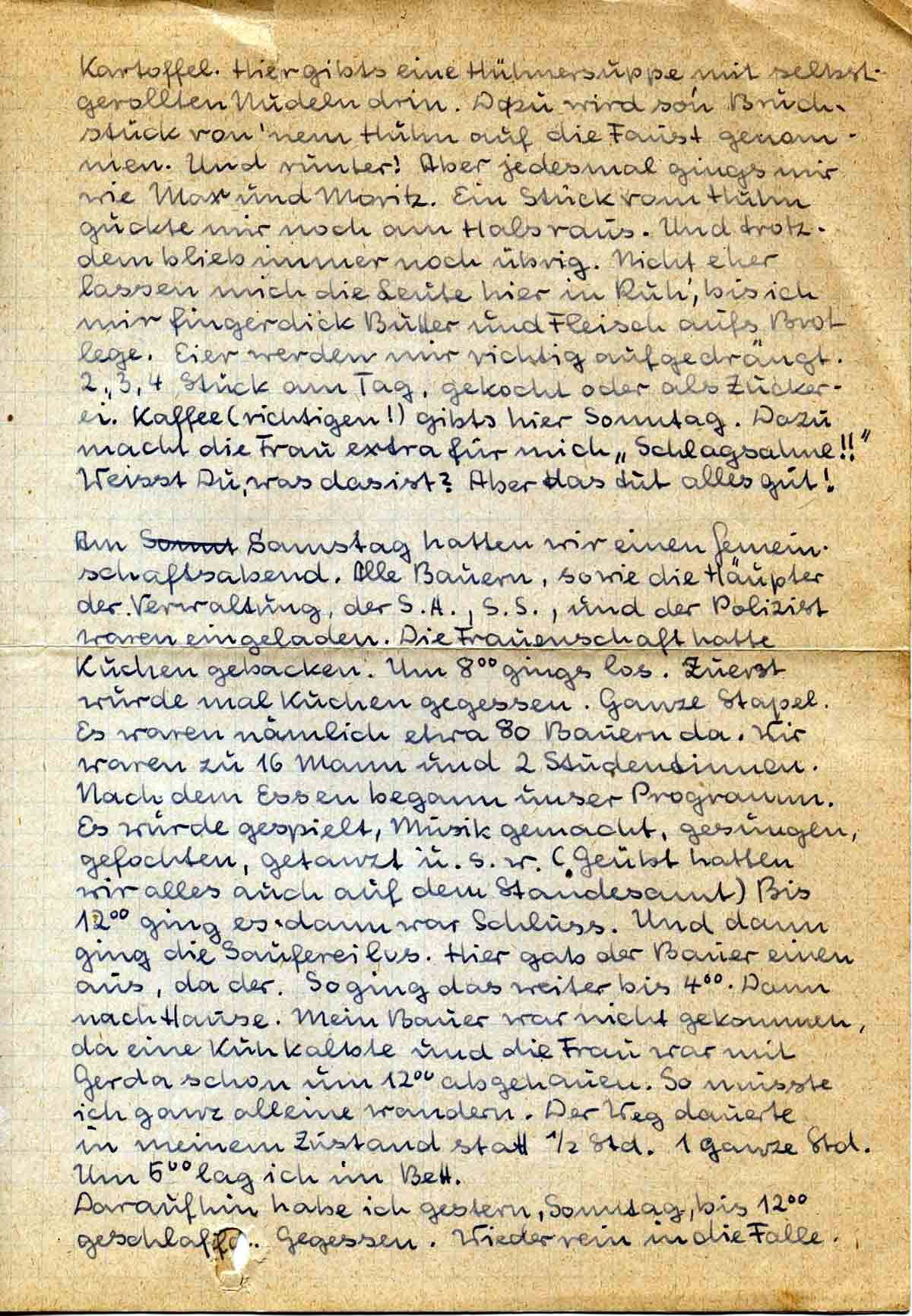 Am Samstag hatten wir einen Gemeinschaftsabend. Alle Bauern, sowie die Häupter der Verwaltung, der S.A., S.S., und der Polizist waren eingeladen. Die Frauenschaft hatte Kuchen gebacken. Um 8.00 gings los. Zuerst wurde mal Kuchen gegessen. Ganze Stapel. Es waren nämlich etwa 80 Bauern da. Wir waren zu 16 Mann und 2 Studentinnen. Nach dem Essen begann unser Programm. Es wurde gespielt, Musik gemacht, gesungen, gefochten, getanzt u. s. w. (Geübt hatten wir alles auch auf dem Standesamt) Bis 12.00 ging es dann war Schluss. Und dann ging die Sauferei los. Hier gab der Bauer einen aus, da der. So ging das weiter bis 4.00. Dann nach Hause. Mein Bauer war nicht gekommen, da eine Kuh kalbte und die Frau war mit Gerda schon um 12.00 abgehauen. So musste ich ganz alleine wandern. Der Weg dauerte in meinem Zustand statt ½ Std. 1 ganze Std. Um 5.00 lag ich im Bett.