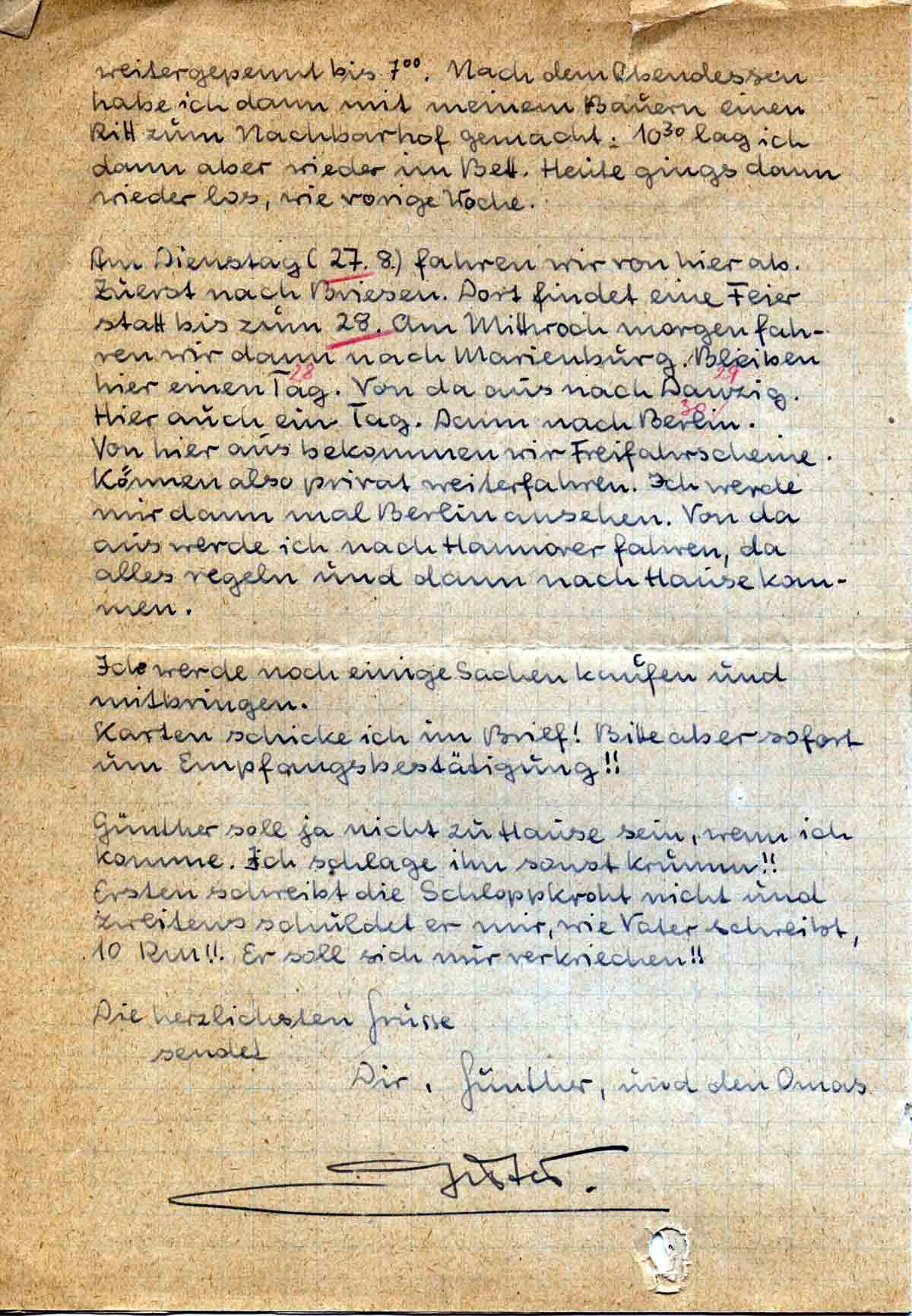 Am Dienstag (27.8.) fahren wir von hier ab. Zuerst nach Briesen. Dort findet eine Feier statt bis zum 28. Am Mittwoch morgen fahren wir dann nach Marienburg. Bleiben hier einen Tag (28). Von da aus nach Danzig (29). Hier auch ein Tag. Dann nach Berlin (30). Von hier aus bekommen wir Freifahrscheine. Können also privat weiterfahren. Ich werde mir dann mal Berlin ansehen. Von da aus werde ich nach Hannover fahren, da alles regeln und dann nach Hause kommen.