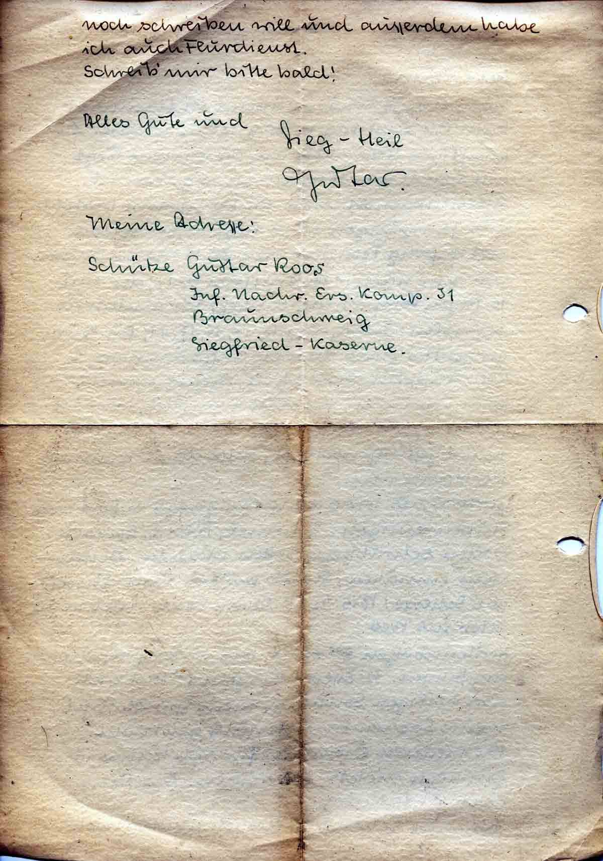 Nach einem schönen Abend in Hannover kam ich Samstag mittag 12.00 in meiner zukünftigen Wohnstätte an. Die Kaserne liegt am Rande von Braunschweig und ist Strassenbahnstation. Die Kompanie besteht aus Jahrgängen 21-20 liegt aber schon seit Anfang Februar hier. Zu 6 Mann kamen wir nun nach: 1 Rekrut (von O-T), der mit 10 Tagen Verspätung einlief) wir andern Reservisten: Jahrgang 12, 16, 15, 17, 21; ein Bürgermeister eines kleinen Kaffs im Harz, 2 RAD-Truppführer, ein Pole, Dreher, spricht kaum deutsch, schreibt garnicht, war Soldat im polnischen Heer und 39 in russischer Gefangenschaft, und dazu komme ich dann noch.