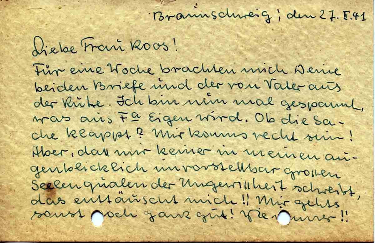 Gustav Roos an Mutter Elisabeth, 27. Februar 1941