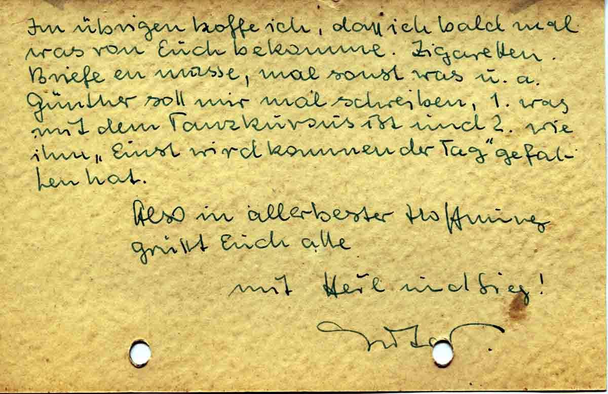 Für eine Woche brachten mich Deine beiden Briefe und der von Vater aus der Ruhe. Ich bin nun mal gespannt, was aus Fa. Eigen wird. Ob die Sache klappt? Mir kanns recht sein! Aber, dass mir keiner in meinen augenblicklich unvorstellbar grossen Seelenqualen der Ungewissheit schreibt, das enttäuscht mich!! Mir gehts sonst noch ganz gut! Wie immer!!