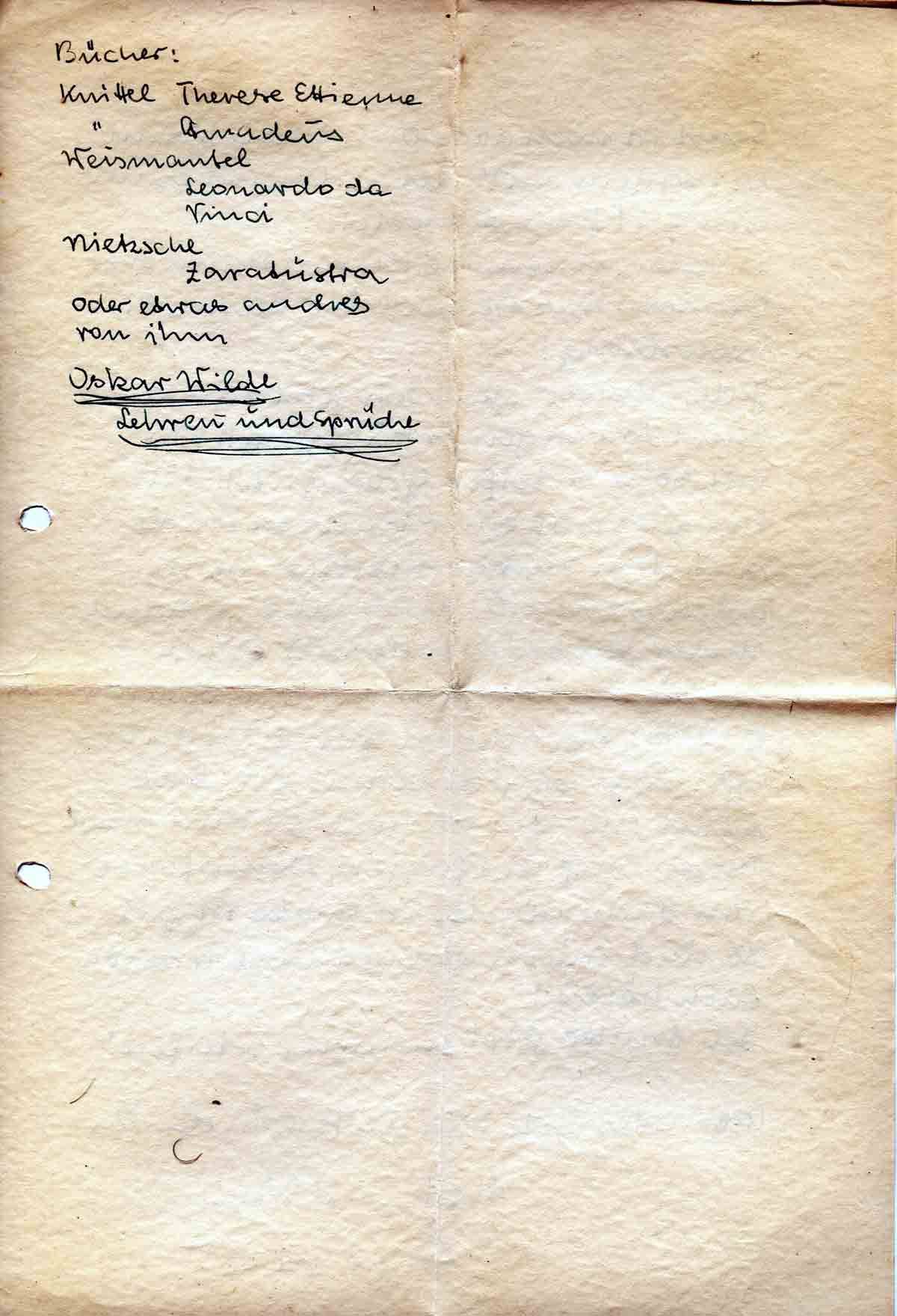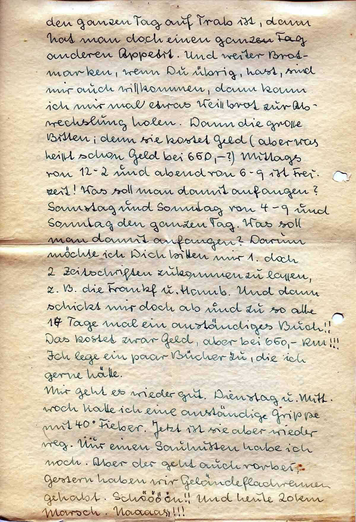 den ganzen Tag auf Trab ist, dann hat man doch einen ganz anderen Appetit. Und weiter Brotmarken, wenn Du übrig, hast, sind mir auch willkommen, dann kann ich mir mal etwas Weißbrot zur Abwechslung holen. Dann die große Bitten; denn sie kostet Geld (aber was heißt schon Geld bei 650,-?) Mittags von 12-2 und abend von 6-9 ist Freizeit! Was soll man damit anfangen? Samstag und Sonntag von 4-9 und Sonntag den ganzen Tag. Was soll man damit anfangen? Darum möchte ich Dich bitten mir 1. doch 2 Zeitschriften zukommen zu lassen, z. B. die Frankf. u. Hamb. Und dann schickt mir doch ab und zu so alle 14 Tage mal ein anständiges Buch!! Das kostet zwar Geld, aber bei 650,- RM!!! Ich lege ein paar Bücher zu, die ich gerne hätte.