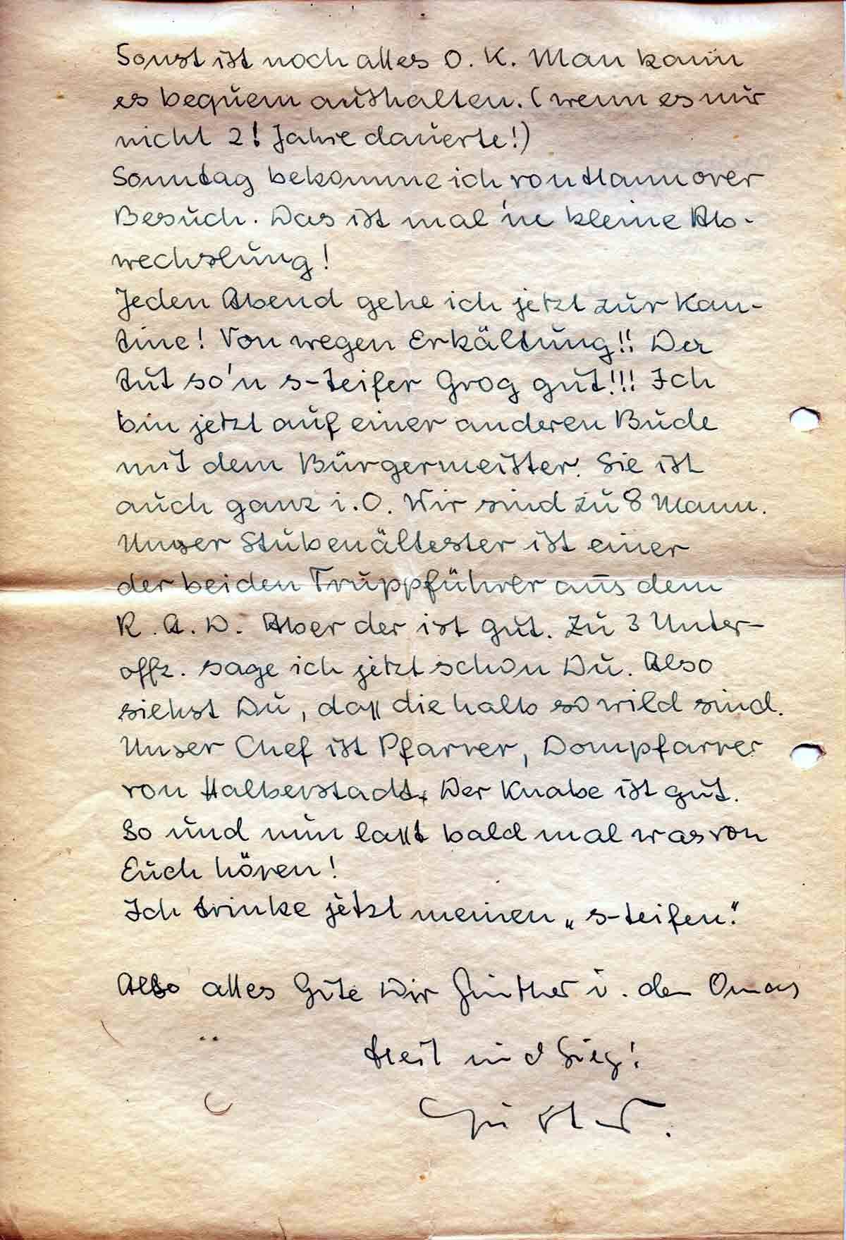 Jeden Abend gehe ich jetzt zur Kantine! Von wegen Erkältung!! Da tut so’n s-teifer Grog gut!!! Ich bin jetzt auf einer anderen Bude mit dem Bürgermeister. Sie ist auch ganz i. O. Wir sind zu 8 Mann. Unser Stubenältester ist einer der beiden Truppführer aus dem R.A.D. Aber der ist gut. Zu 3 Unteroffz. sage ich jetzt schon Du. Also siehst Du, dass die halb so wild sind. Unser Chef ist Pfarrer, Dompfarrer von Halberstadt. Der Knabe ist gut. So und nun lasst bald mal was von Euch hören!