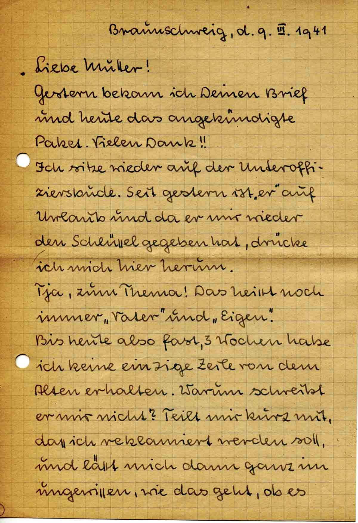 Gustav Roos an Mutter Elisabeth, 9. März 1941