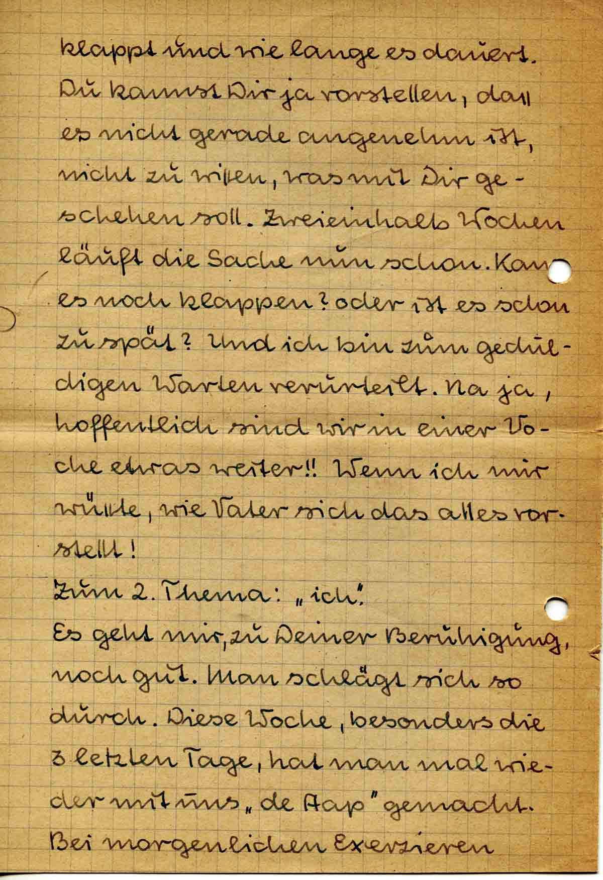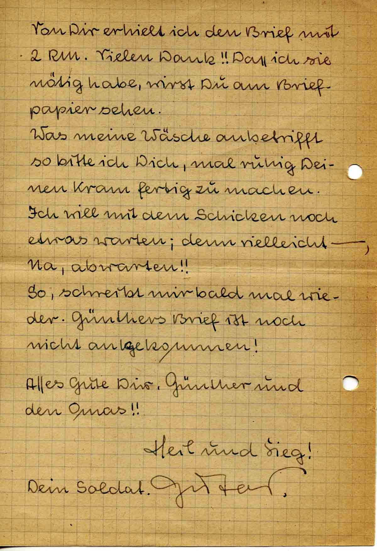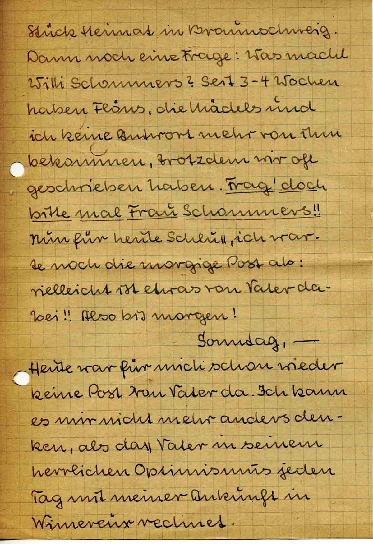Dann noch eine Frage: Was macht Willi Schommers? Seit 3-4 Wochen haben Flöns, die Mädels und ich keine Antwort mehr von ihm bekommen, trotzdem wir oft geschrieben haben. Frag’ doch bitte mal Frau Schlommers!! Nun für heute Schluss, ich warte noch die morgige Post ab: vielleicht ist etwas von Vater dabei!! Also bis morgen!
