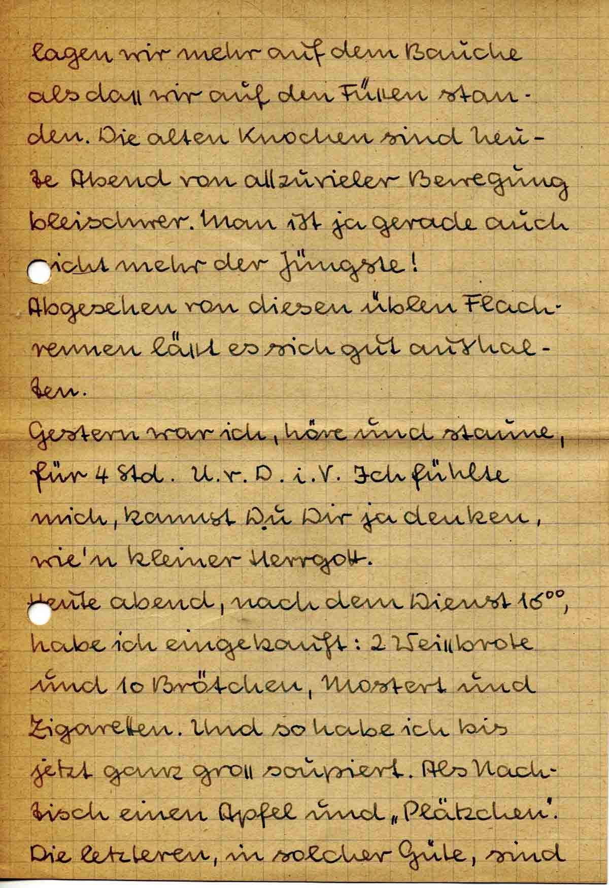 Heute abend, nach dem Dienst 16.00, habe ich eingekauft: 2 Weissbrote und 10 Brötchen, Mostert und Zigaretten. Und so habe ich bis jetzt ganz gross soupiert. Als Nachtisch einen Apfel und „Plätzchen“. Die letzteren, in solcher Güte, sind