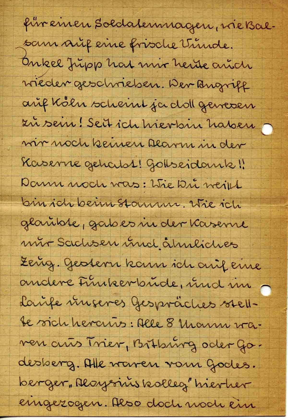 Onkel Jupp hat mir heute auch wieder geschrieben. Der Angriff auf Köln scheint ja doll gewesen zu sein! Seit ich hier bin haben wir noch keinen Alarm in der Kaserne gehabt! Gottseidank!! Dann noch was: Wie Du weisst bin ich beim Stamm. Wie ich glaubte, gab es in der Kaserne nur Sachsen und ähnliches Zeug Gestern kam ich auf eine andere Funkerbude, und im Laufe unseres Gespräches stellte sich heraus: Alle 8 Mann waren aus Trier, Bitburg oder Godesberg. Alle waren vom Godesberger „Aloysiuskolleg“ hierher eingezogen. Also doch noch ein