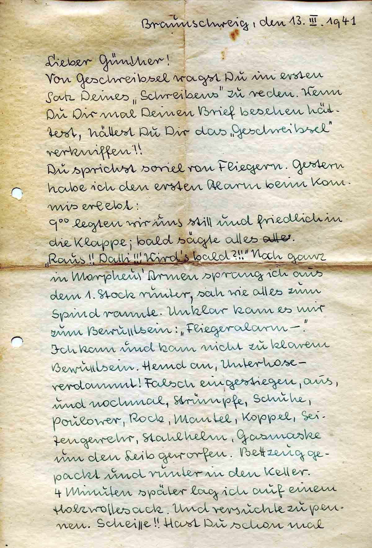 9.00 legten wir uns still und friedlich in die Klappe; bald sägte alles. „Raus!! Dalli!!! Wird’s bald?!!“ Noch ganz in Morpheus’ Armen sprang ich aus dem 1. Stock runter, sah wie alles zum Spind rannte. Unklar kam es mir zum Bewusstsein: „Fliegeralarm –“. Ich kam und kam nicht zu klarem Bewusstsein. Hemd an, Unterhose – verdammt! Falsch eingestiegen, aus, und nochmal, Strümpfe, Schuhe, Poulower, Rock, Mantel, Koppel, Seitengewehr, Stahlhelm, Gasmaske um den Leib geworfen. Bettzeug gepackt und runter in den Keller. 4 Minuten später lag ich auf einem Holzwollesack. Und versuchte zu pennen. Scheisse!! Hast Du schon mal