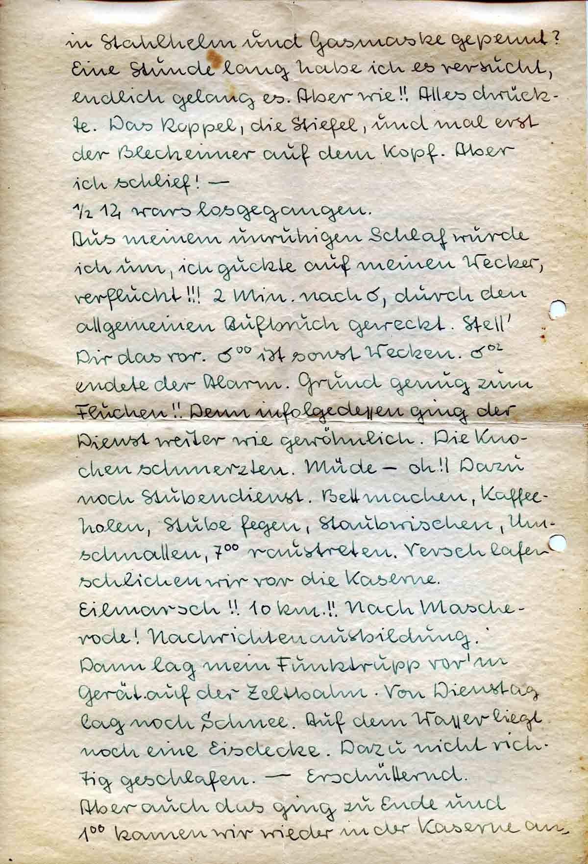 in Stahlhelm und Gasmaske gepennt? Eine Stunde lang habe ich es versucht, endlich gelang es. Aber wie!! Alles drückte. Das Koppel, die Stiefel, und mal erst der Blecheimer auf dem Kopf. Aber ich schlief! -