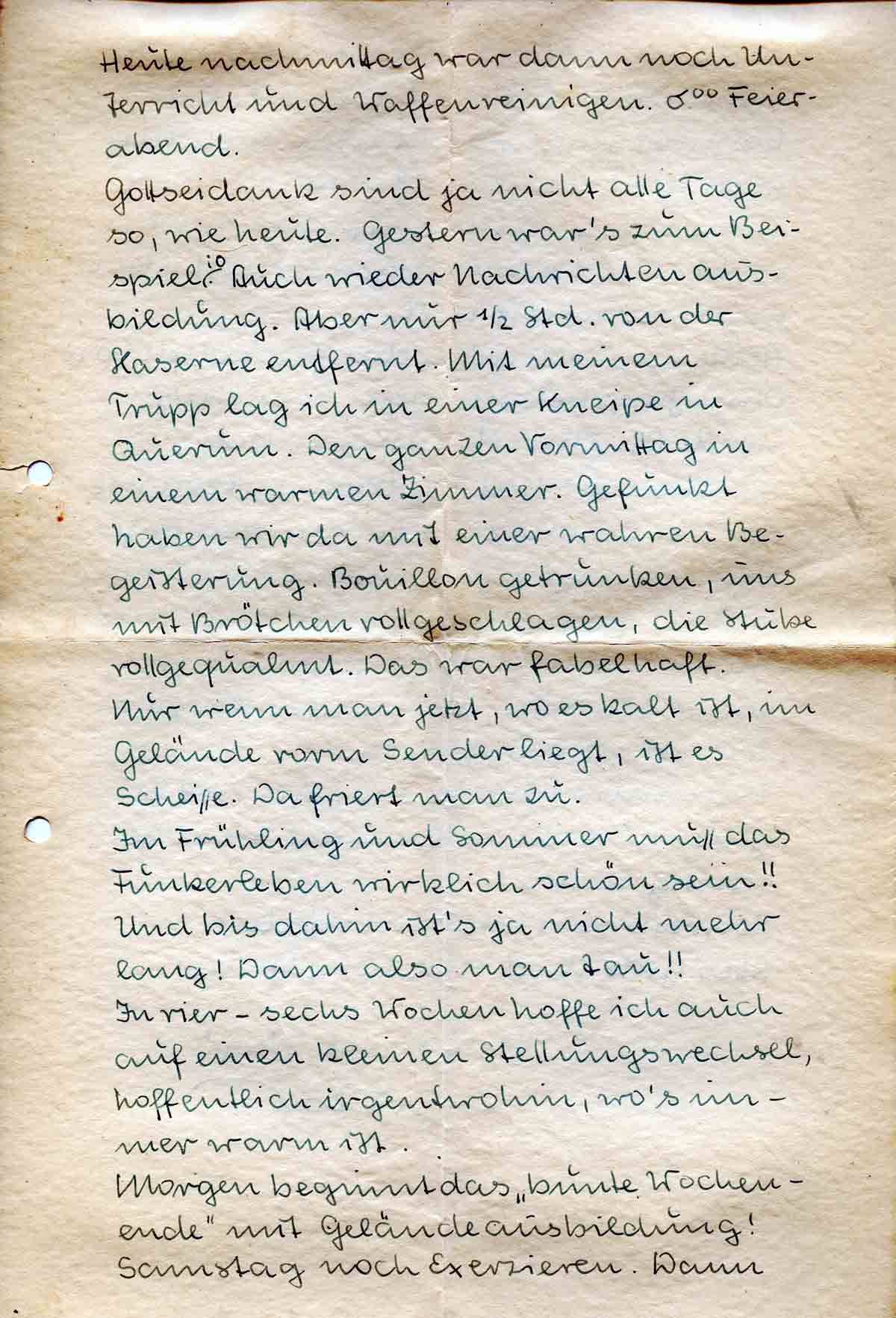Gottseidank sind ja nicht alle Tage so, wie heute. Gestern war’s zum Beispiel i. O. Auch wieder Nachrichtenausbildung. Aber nur ½ Std. von der Kaserne entfernt. Mit meinem Trupp lag ich in einer Kneipe in Querum. Den ganzen Vormittag in einem warmen Zimmer. Gefunkt haben wir da mit einer wahren Begeisterung. Bouillon getrunken, uns mit Brötchen vollgeschlagen, die Stube vollgequalmt. Das war fabelhaft. Nur wenn man jetzt, wo es kalt ist, im Gelände vorm Sender liegt, ist es Scheisse. Da friert man zu.