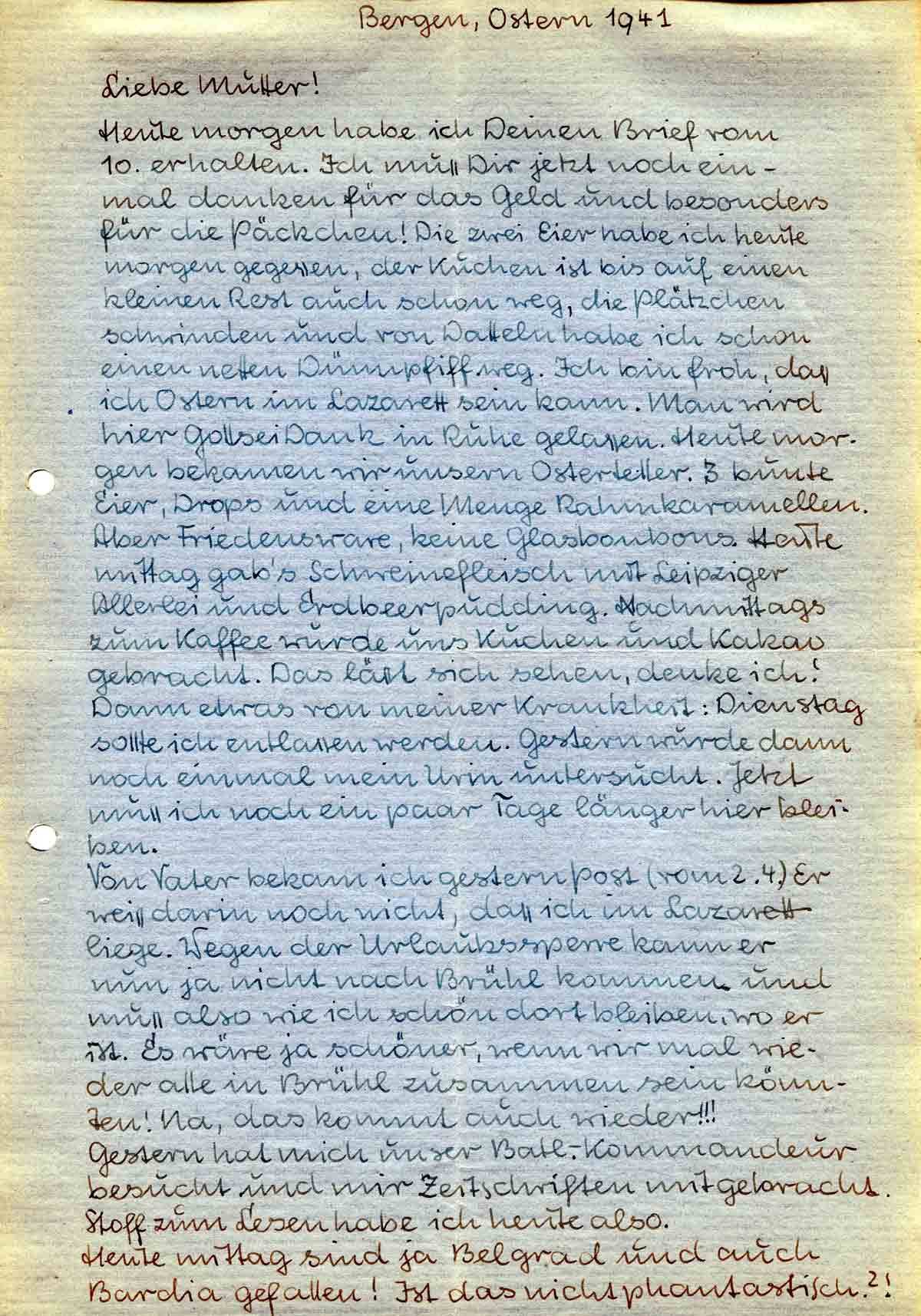 Von Vater bekam ich gestern Post (vom 2.4.) Er weiss darin noch nicht, dass ich im Lazarett liege. Wegen der Urlaubssperre kann er nun ja nicht nach Brühl kommen und muss also wie ich schön dort bleiben, wo er ist. Es wäre ja schöner, wenn wir mal wieder alle in Brühl zusammen sein könnten! Na, das kommt auch wieder!!!