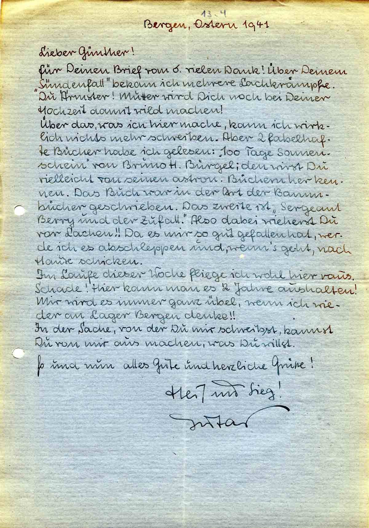 Über das, was ich hier mache, kann ich wirklich nichts mehr schreiben. Aber 2 fabelhafte Bücher habe ich gelesen: „100 Tage Sonnenschein“ von Bruno H. Bürgel; den wirst Du vielleicht von seinen astron. Büchern her kennen. Das Buch war in der Art der Bannnbücher[=?] geschrieben. Das zweite ist „Sergeant Berry und der Zufall“. Also dabei wieherst Du vor Lachen!! Da es mir so gut gefallen hat, werde ich es abschleppen und, wenn’s geht, nach Hause schicken.