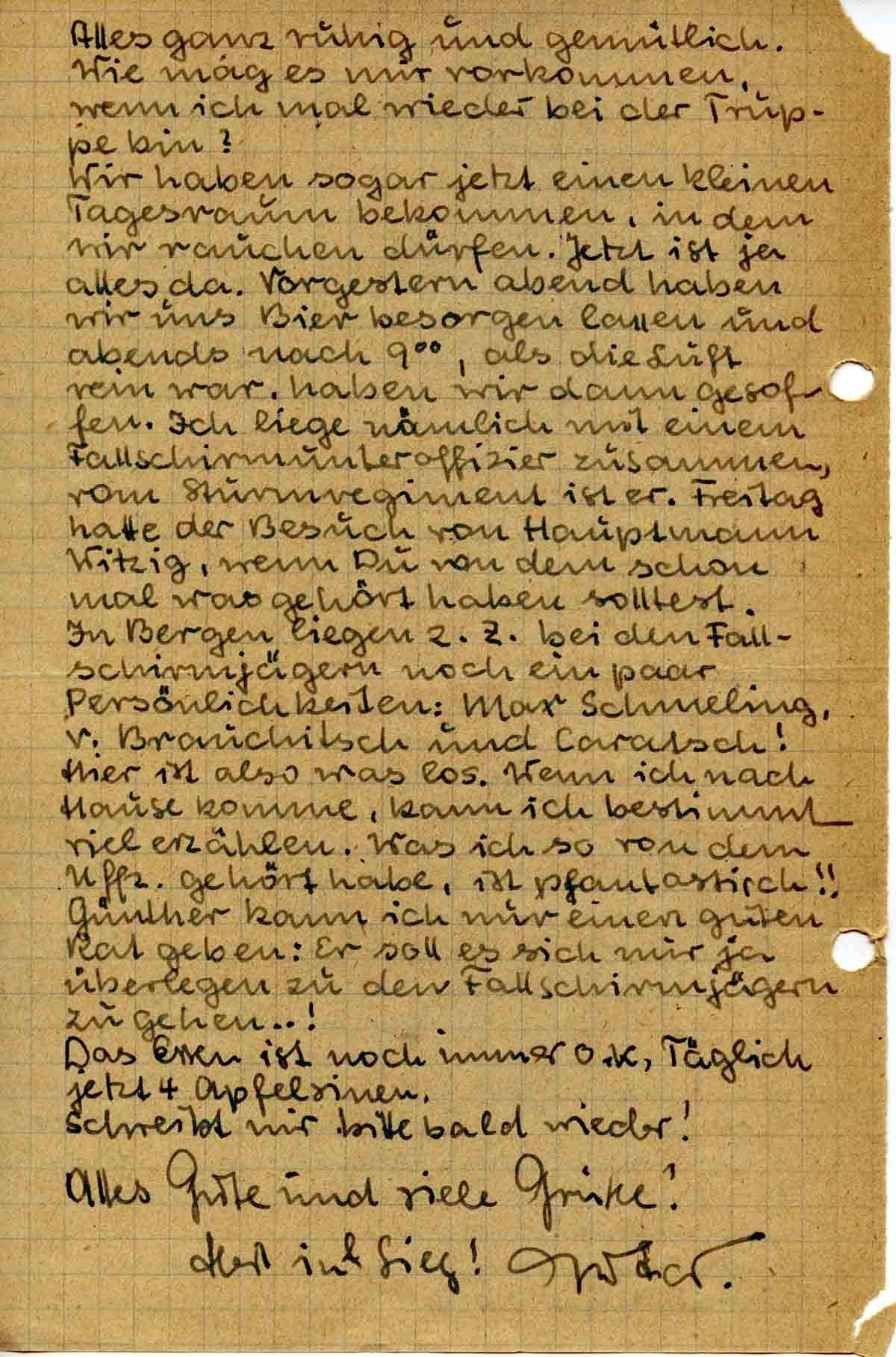 Wir haben sogar jetzt einen kleinen Tagesraum bekommen, in dem wir rauchen dürfen. Jetzt ist ja alles da. Vorgestern abend haben wir uns Bier besorgen lassen und abends nach 9.00, als die Luft rein war, haben wir dann gesoffen. Ich liege nämlich mit einem Fallschirmunteroffizier zusammen, vom Sturmregiment ist er. Freitag hatte der Besuch von Hauptmann Witzig, wenn Du von dem schon mal was gehört haben solltest. In Bergen liegen z. Z. bei den Fallschirmjägern noch ein paar Persönlichkeiten: Max Schmeling, v. Brauchitsch und Caratsch! Hier ist also was los. Wenn ich nach Hause komme, kann ich bestimmt viel erzählen. Was ich so von dem Uffz. gehört habe, ist phantastisch!! Günther kann ich nur einen guten Rat geben: Er soll es sich nur ja überlegen zu den Fallschirmjägern zu gehen..!