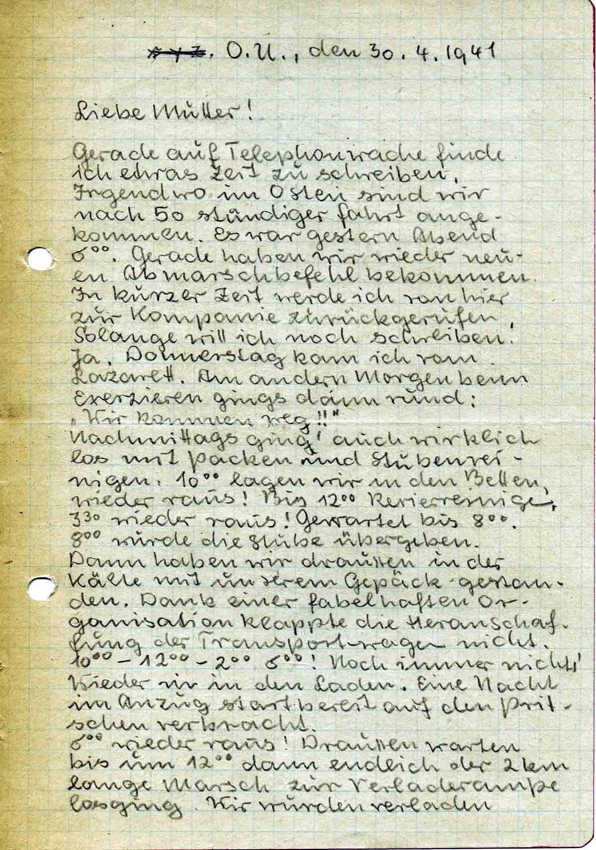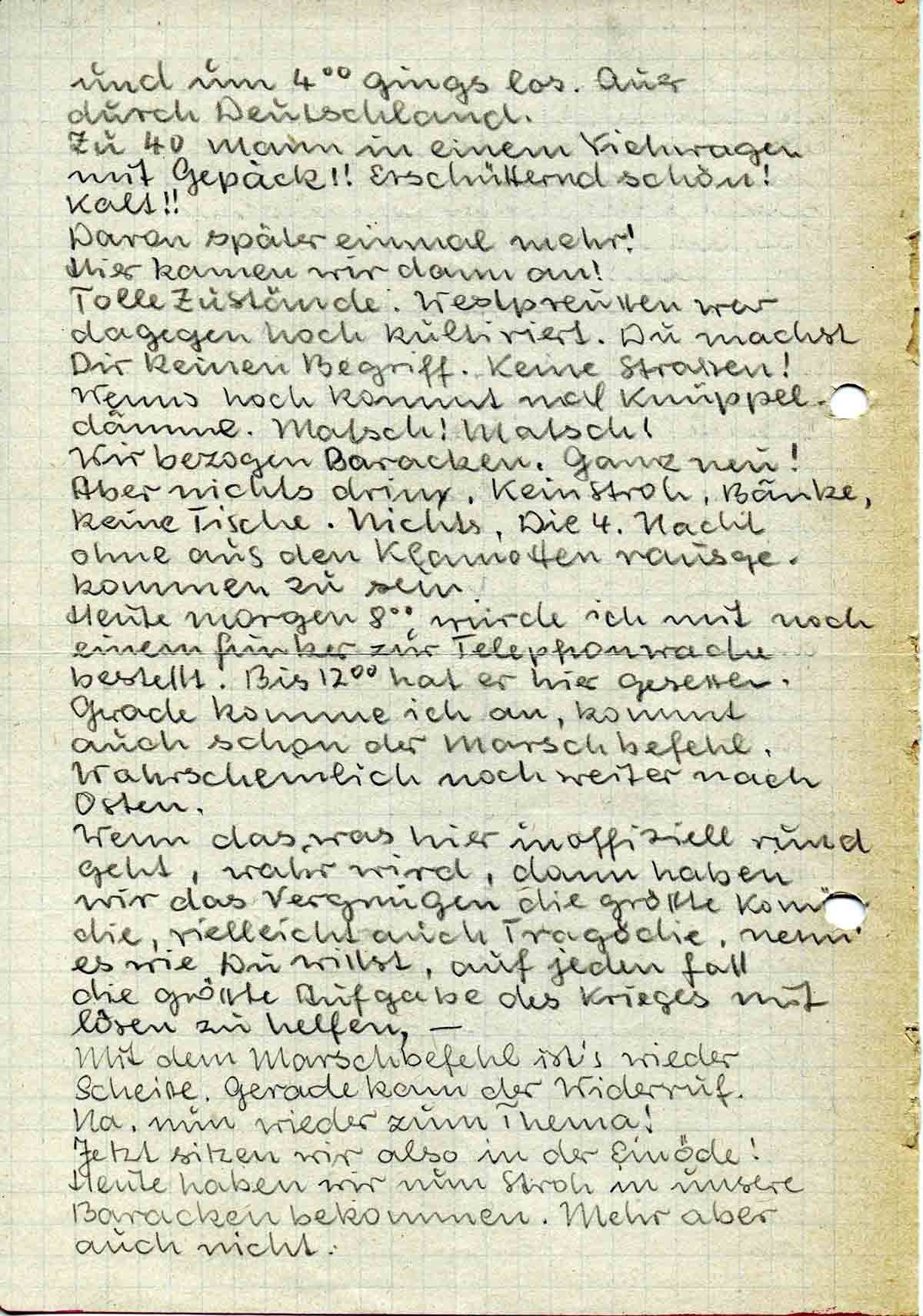 Gerade auf Telephonwache finde ich etwas Zeit zu schreiben. Irgendwo im Osten sind wir nach 50 stündiger Fahrt angekommen. Es war gestern Abend 6.00. Gerade haben wir wieder neuen Abmarschbefehl bekommen. In kurzer Zeit werde ich von hier zur Kompanie zurückgerufen. Solange will ich noch schreiben. Ja, Donnerstag kam ich vom Lazarett. Am andern Morgen beim Exerzieren gings dann rund: „Wir kommen weg!!“