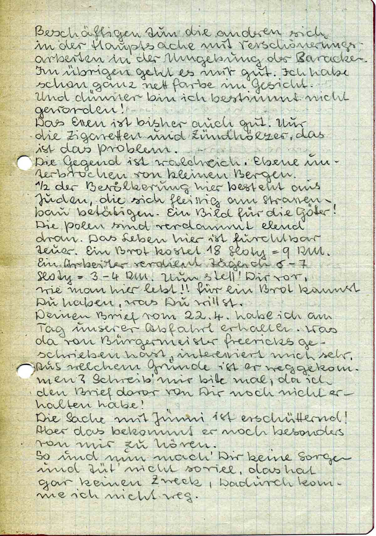 Die Gegend ist waldreich. Ebene unterbrochen von kleinen Bergen. ½ der Bevölkerung hier besteht aus Juden, die sich fleissig am Strassenbau betätigen. Ein Bild für die Götter! Die Polen sind verdammt elend dran. Das Leben hier ist furchtbar teuer. Ein Brot kostet 18 Sloty = 9 RM. Ein Arbeiter verdient täglich 6-7 Sloty = 3-4 RM. Nun stell’ Dir vor, wie man hier lebt!! Für ein Brot kannst Du haben, was Du willst.