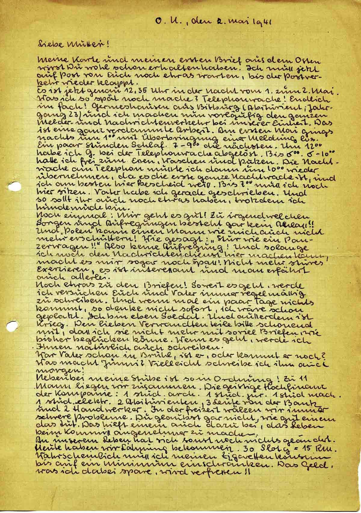 Es ist jetzt genau 12.35 Uhr in der Nacht vom 1. zum 2. Mai. Was ich so spät noch mache? Telephonwache! Endlich im Fach! Germeshausen aus Bitburg (Abiturient; Jahrgang 23) und ich machen nun vorläufig den ganzen Melder- und Nachrichtenverkehr bei unserer Einheit. Das ist eine ganz verdammte Arbeit. Am ersten Mai gings nachts um 1.00 mit Überbringung einer Meldung los. Ein paar Stunden Schlaf. 7-9.00 die nächsten. Um 12.00 habe ich G. bei der Telephonwache abgelöst. Bis 6.00. 6-10.00 hatte ich frei zum Essen, Waschen und Putzen. Die Nachtwache am Telephon musste ich dann um 10.00 wieder übernehmen, da es die erste ganze Nachtwache ist, und ich am besten hier Bescheid weiss. Bis 7.00 muss ich noch hier sitzen. Vater habe ich gerade geschrieben. Und so sollt ihr auch noch etwas haben, trotzdem ich hundemüde bin.